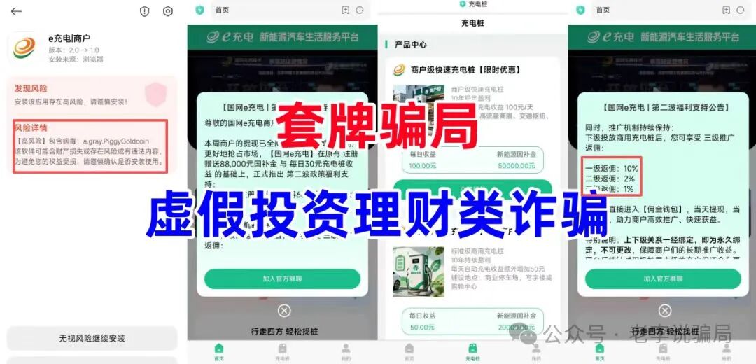 冒充某公司,声称实名注册即可获得8.8万元的国补金以及66元电力金。同时推出“商户级快速充电桩”“标准级商用充电桩”等高额返利理财项目。