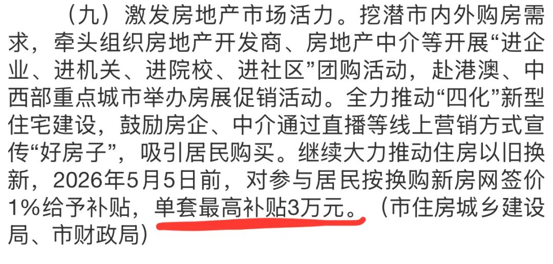2026年5月5日前,对参与居民按换购新房网签价1%给予补贴,单套最高补贴3万元。