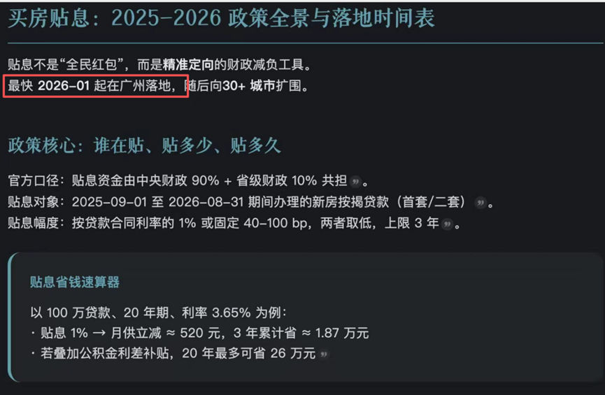 如果传闻是真的,这波真金白银的补贴,将实实在在减轻购房者的压力。房贷利率也有望或将进入“2%时代”!来看看大家比较关心的信息点。1)房贷贴息政策,主要针对2025年9月1日-2026年8月31日期间办理的新房按揭贷款,首套和二套,刚需和改善全覆盖。2)贴息按照合同利率的1%或固定40-100bp,两者取低,上限3年。相当于把当前3%左右的房贷利率,直接拉低到了1%-2%时代!以20年期的100万贷款为例,目前利率3.65,按贴息1%来算,3年累计可省1.87万。若叠加公积金利差补贴,20年最高可省26万元。3)该政策最快26年1月起在广州落地,随后向30+城市扩围。另外,地区和困难放弃可能提高到2%。而另一个政策方向 ,购房补贴,广东已经有城市这么干了。
