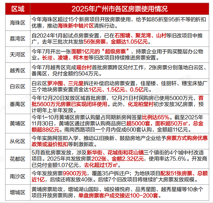 相信不少人会问,广州会跟吗?这个不好说。广州楼市另一个大招则是:房票!数据显示,2025年广州通过房票认购房源约5500套,认购面积超55万㎡,认购资金约98亿元。全市11个区都有房票成交,承接房票项目总共110个。