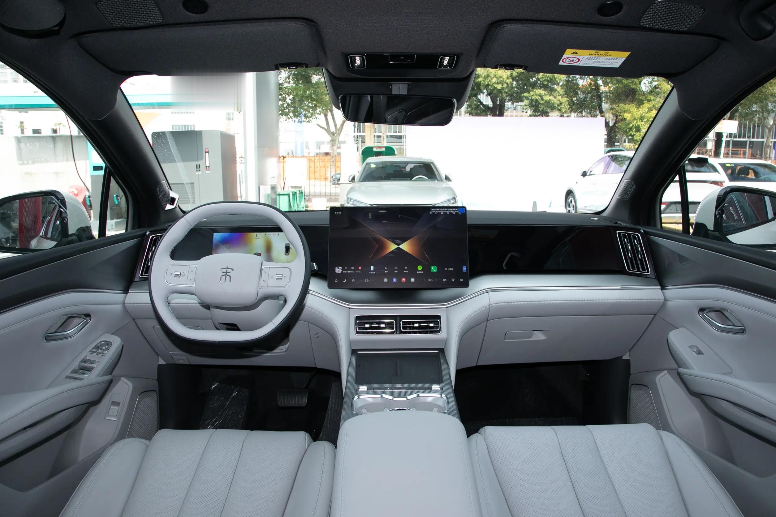内饰方面,这款车所营造的豪华氛围和科技氛围还是很不错的,配备了10.25英寸液晶仪表盘+15.6英寸中控屏幕+26英寸W-HUD投屏,DiLink系统支持卫星导航、四区域语音识别控制、面部识别、5G车联网、手机APP远程功能和OTA升级等,前排还标配50W手机无线充电面板。