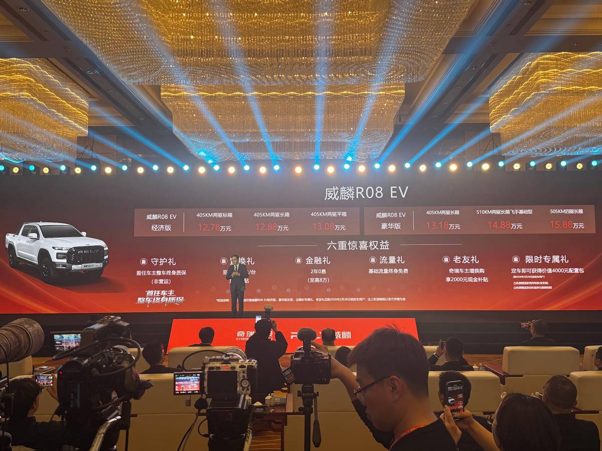 1月27日,奇瑞汽车全新纯电皮卡车型威麟R08 EV正式上市,同时,RELY威麟宣布启动“麒麟来电生态联盟”。新车共推出6款车型,分为经济版、豪华版两大版本,并提供包括植保飞手型在内的多种动力与电池配置,售价区间从12.78万元到15.88万元。新车是奇瑞旗下首款纯电皮卡车型,并且采用非承载式车身设计,提供两驱和四驱两种选择。