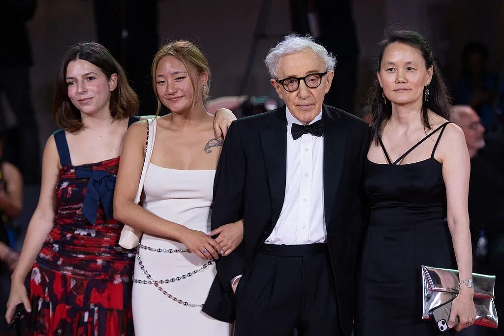 2023年,伍迪·艾伦与小女儿曼兹(左一)、大女儿贝谢(左二)及妻子宋宜(右一)出席威尼斯电影节。