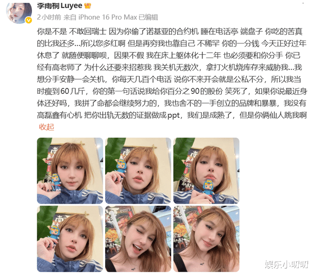 然而让人没想到的是李雨桐接下来的操作可谓是惊呆众人,正常锤别人晒出的照片应该都是聊天记录或者实锤照片,结果这姐晒出的是自己的自拍照。而且搞笑的是李雨桐这发文,有点前言不搭后语,前边要求薛之谦还她表和西装,后边就是自己抑郁躯体化,完全没有逻辑。最重要的是一点实质性的证据没有,全是对薛之谦的控诉。