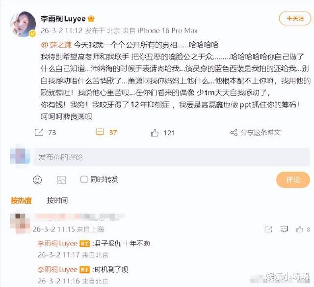 马年居然开年就吃上了薛之谦的瓜,用网友调侃的话来讲就是瓜居然还是个旧瓜,有关李雨桐、薛之谦及高磊鑫之间的爱恨情仇纠缠了好多年了吧。没想到这开年李雨桐实名开锤薛之谦,之间社交平台艾特。李雨桐还表示君子报仇十年不晚,并表示要公开真相,将薛之谦的丑陋嘴脸公之于众。李雨桐发文后一时间引发很大的热议,都在等李雨桐之后能放出什么样的证据来证实自己。