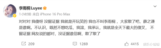 李雨桐还表示,薛之谦和高磊鑫联手仙人跳,设计圈套来陷害、敲诈她。面对李雨桐的操作,网友可能都想看到实质性的证据吧,毕竟空口无凭,而且和薛之谦分手这么多年,又忽然出来锤前男友,多少让人有点怀疑此番操作的目的性。面对网友的猜疑,李雨桐的操作也是让人摸不着头脑,自称自己没留证据,让大家散了吧。