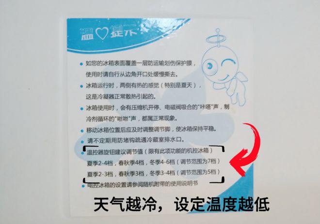 先看看冰箱的说明书,上面有冰箱调温建议:夏天,把温度调高。春秋季节随着气温降低,慢慢把冰箱温度调低。冬天,把温度调到最低。