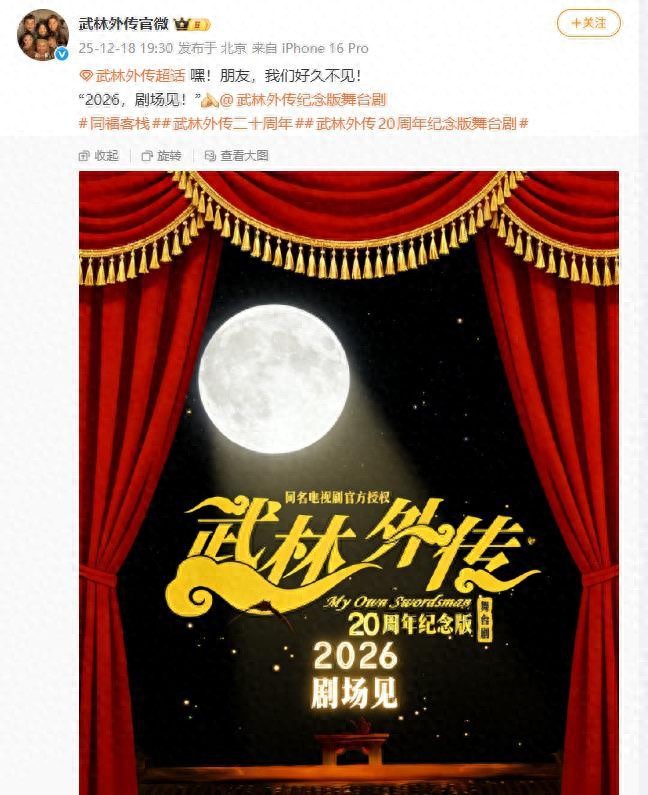 “嘿!朋友,我们好久不见!”12月18日晚,电视剧《武林外传》官方微博公布消息,武林外传20周年纪念版舞台剧,将于2026年与公众在剧场相见。不过,此次舞台剧版的演员阵容及巡演城市暂未确定。不少网友期待,20年前电视剧版的原班人马能再相聚。