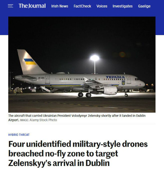 《华尔街日报》消息人士透露,四架“军用型无人机”抵达都柏林机场附近,泽连斯基乘坐的飞机原定于晚上 11 点左右从那里起飞。飞机提前降落,因此避开了无人机。