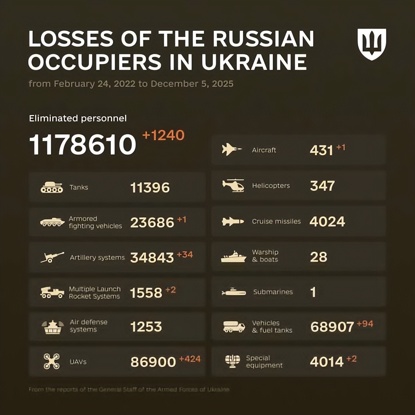 乌总参公布的昨日战果,歼敌(毙+伤)1240人。