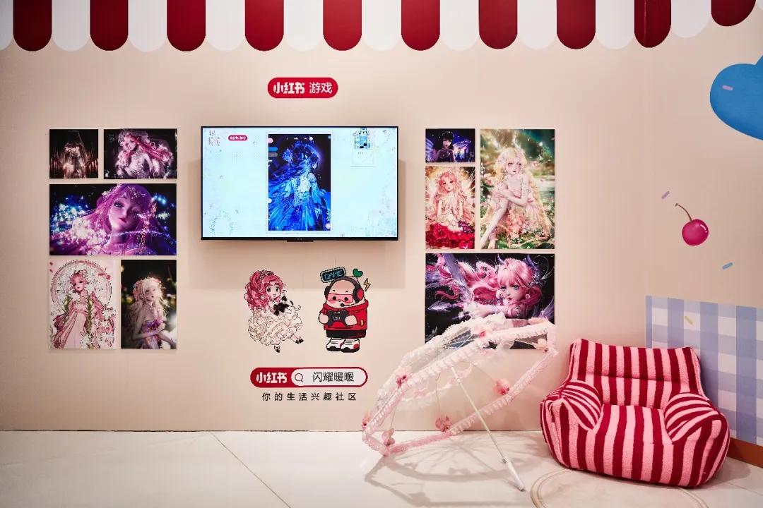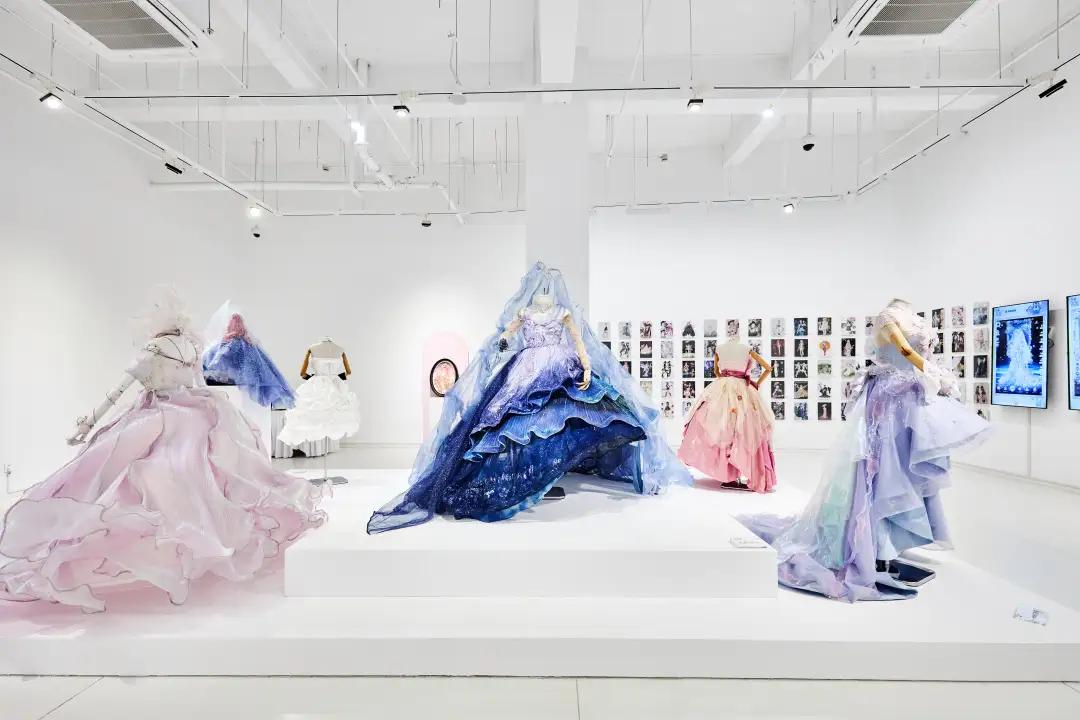 另外值得一提的细节是,闪耀暖暖初始套的形象贯穿展览始终。这是一件粉色格纹、缀有红色蝴蝶结的蓬蓬裙。