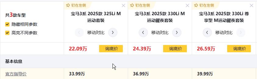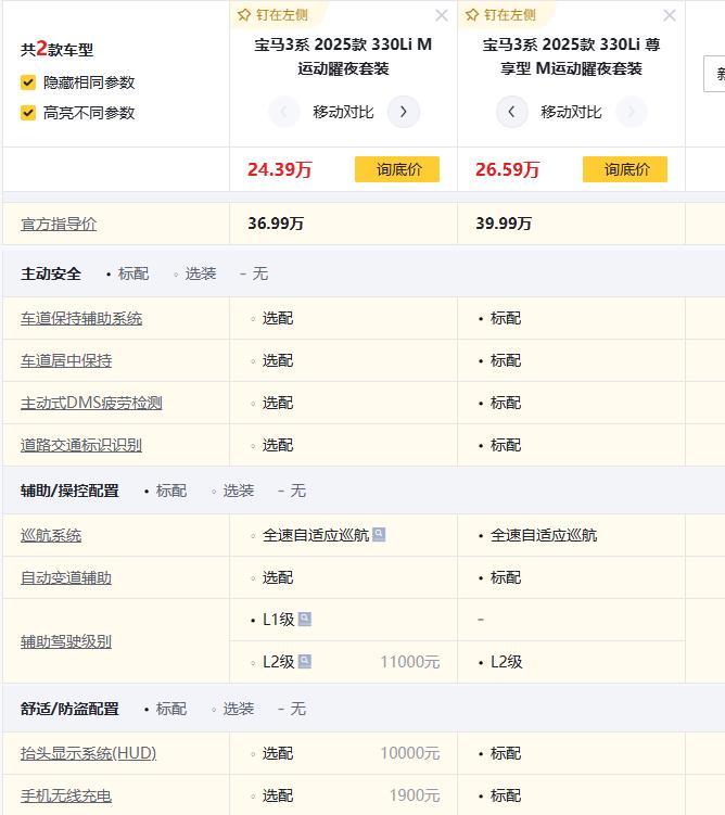 为什么这么说,三款官方指导价差得明明白白:325Li版33.99万,330Li 曜夜版36.99万(差3万),330Li 尊享39.99万版(再差3万),每3万都加了啥配置?