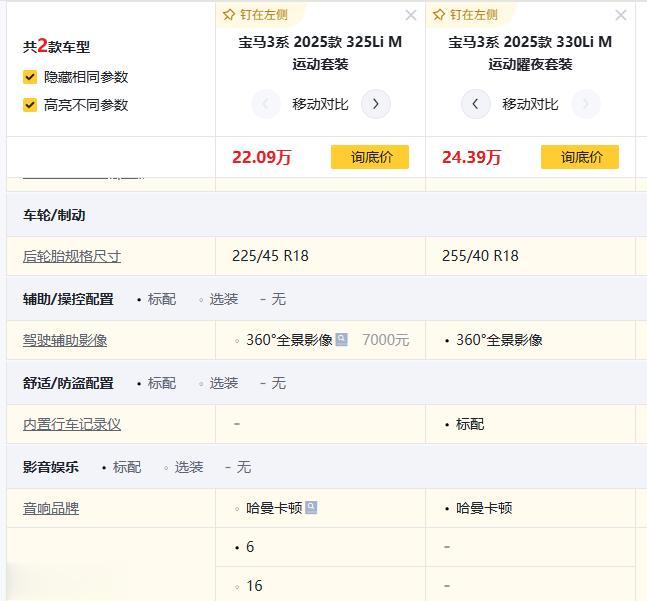 3万差价从325Li版升到330Li 曜夜版,除了动力升级,后胎从225升级到255,抓地力更稳,还多了哈曼卡顿16扬声器,带娃出行放儿歌音质更带劲!但要注意,宝马3系 2025款 325Li M运动套装要选装360全景影像,新手爸妈停车刚需,7000块选装费有点心疼。