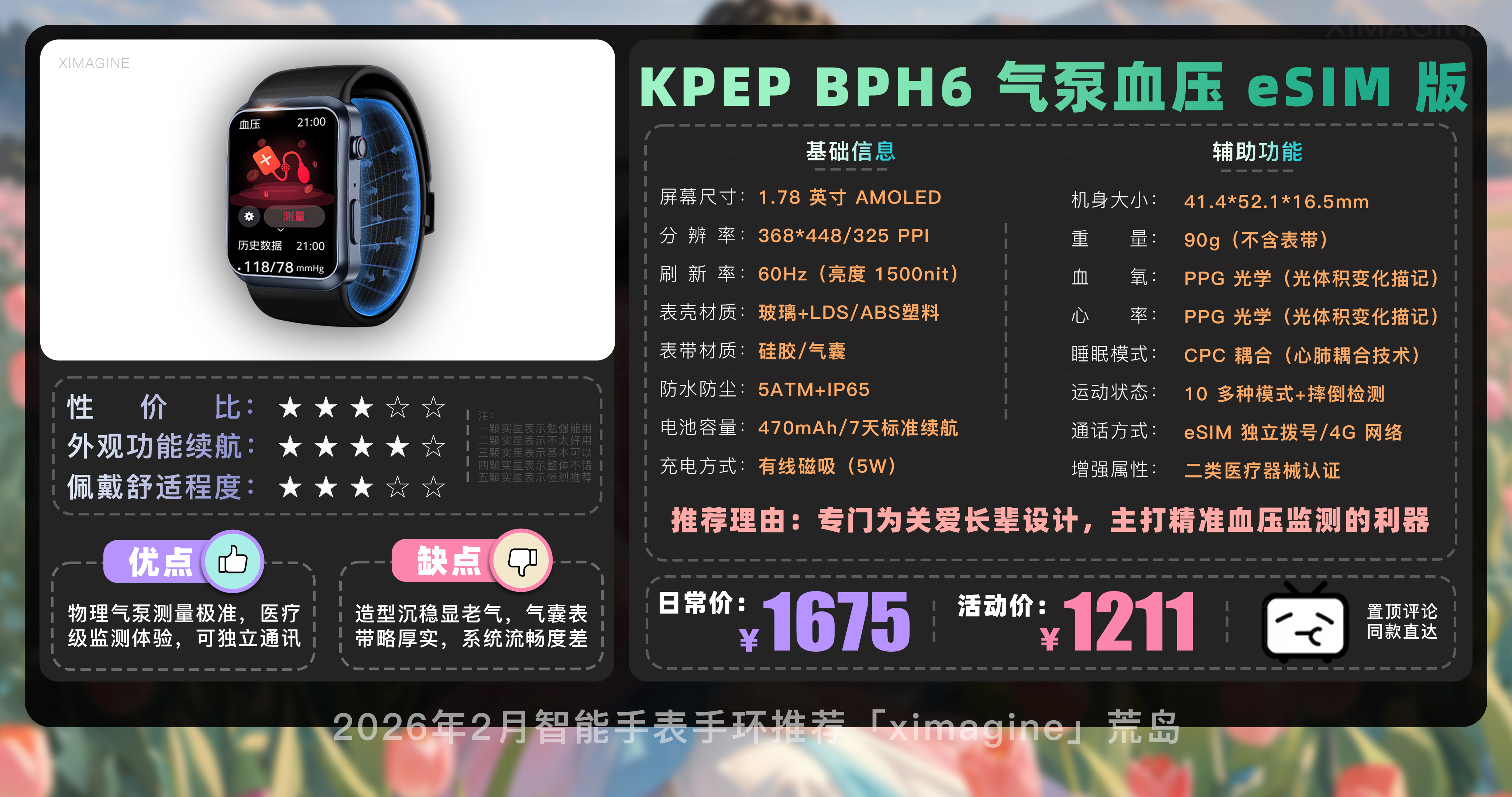 KPEP BPH6 气泵血压 eSIM 通话手表是戴在腕上的医疗级仪器,厚实表带里藏着精密气囊,测量时充气压迫感会让你受到专业,插卡 4G 的加入让它脱离手机的附属地位,可独立守护着佩戴者的健康底线。 每天定时测压数据会实时同步到子女手机,跨空间的关怀是情感价值的体现。长辈独自遛弯时,内置跌倒自动报警和一键求助功能是一道保险,1211 元的它是送给父母长辈的礼物,买一份对家人健康的长期投资。