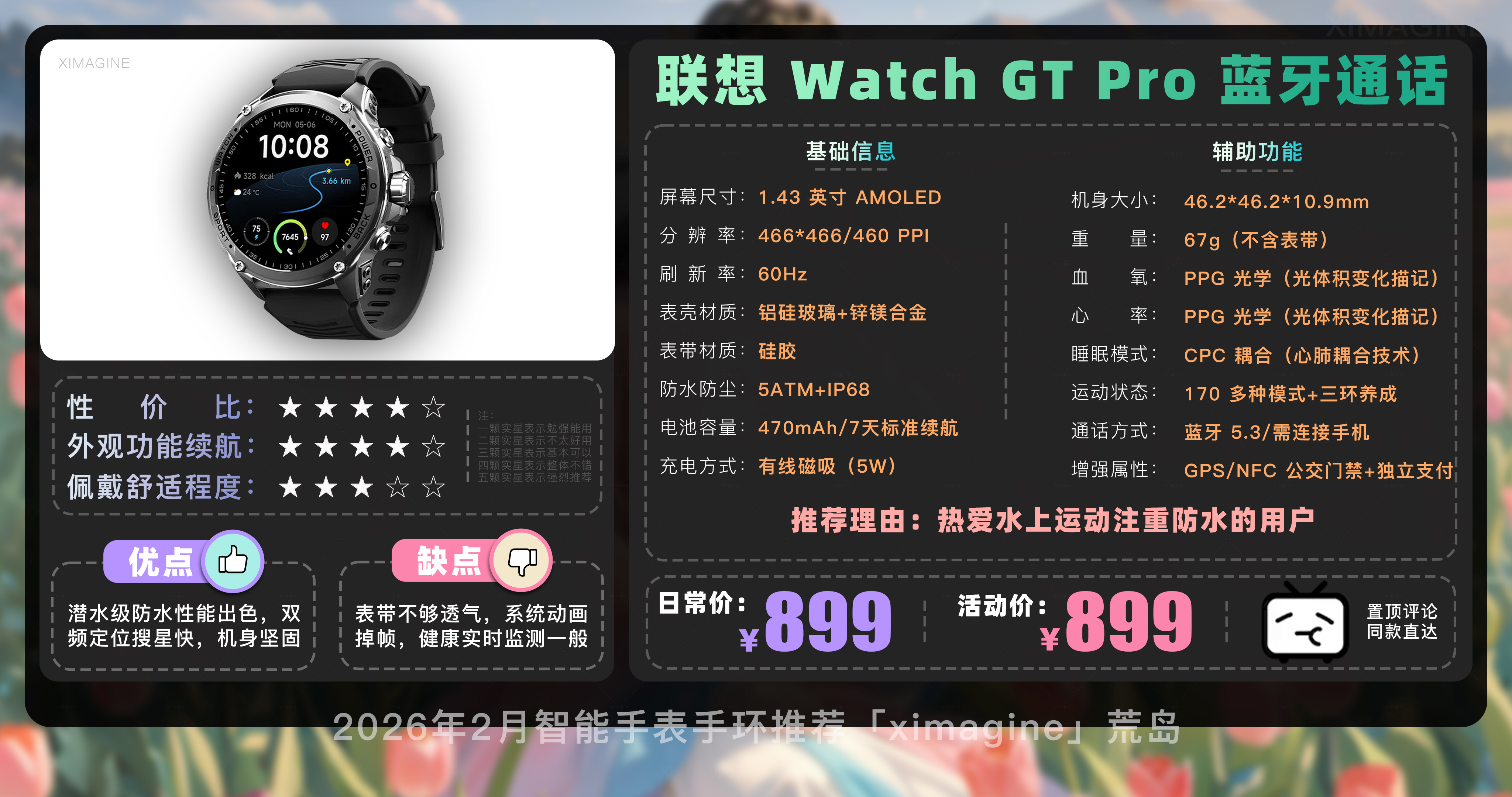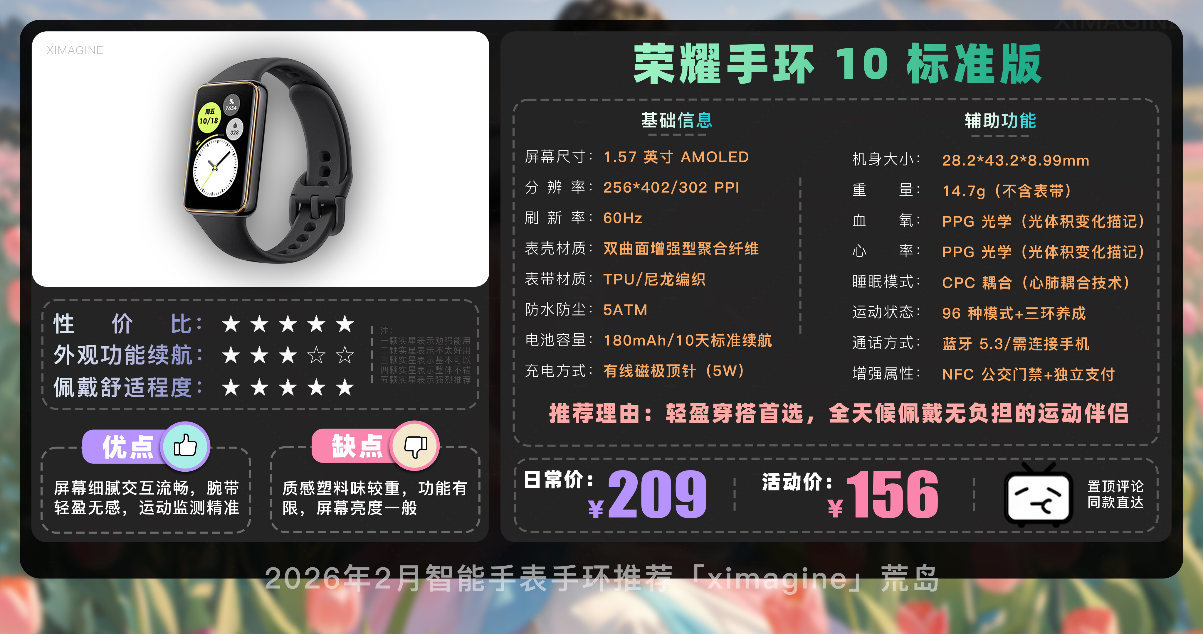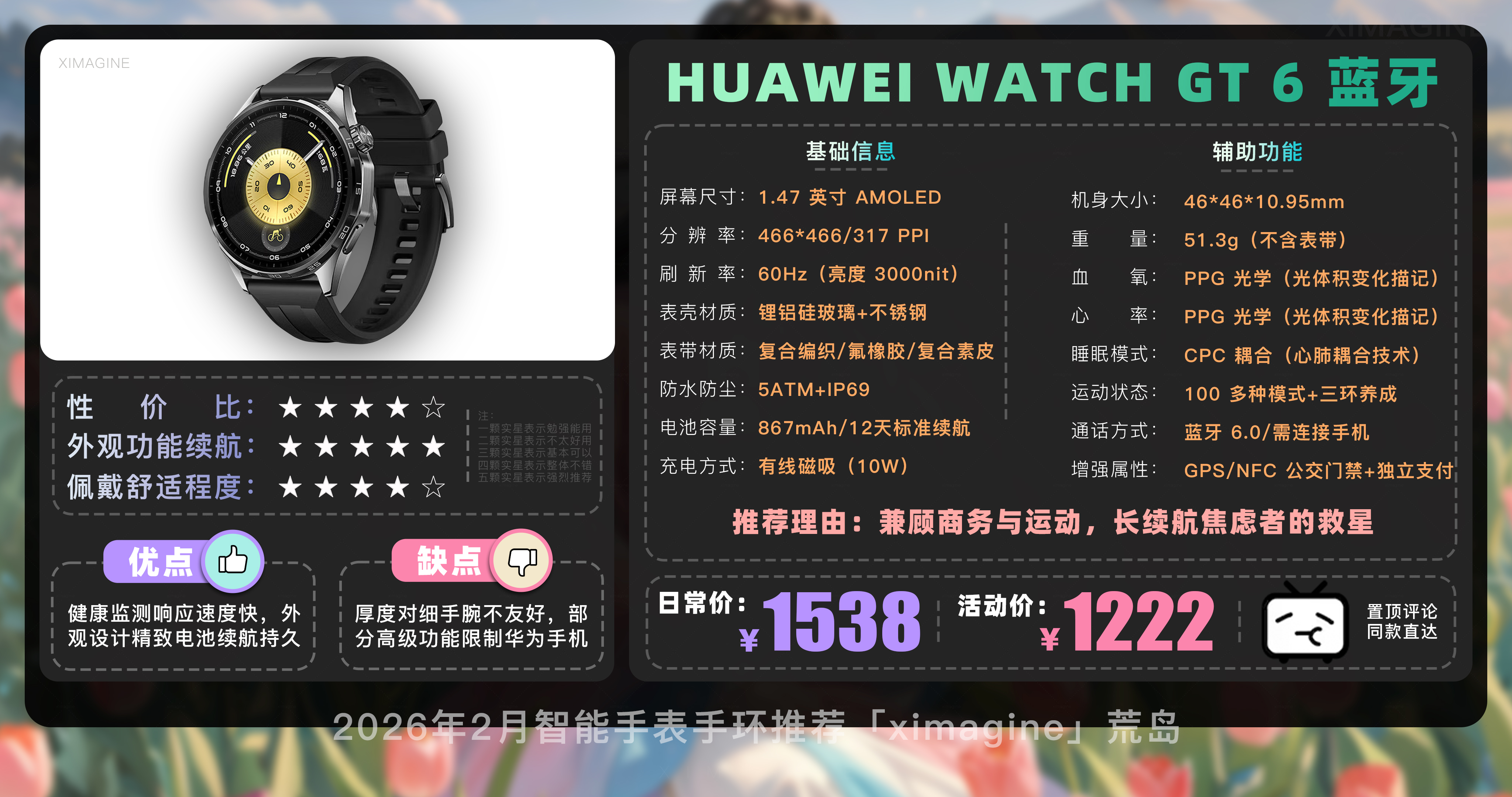 以上就是本期26年2月智能手表手环推荐清单,如果有心水的型号,可以戳置顶评论区对应链接拿下!在这个信息爆炸的时代选择戴上它,是为了在忙碌的缝隙里,能有一个声音温柔地提醒我们要按时喝水;是为了放下手机奔向山海时,依然拥有掌控生活的底气;如果觉得内容有所帮助,请关注荒岛!如果对选购智能穿戴设备还有疑问,欢迎在评论区留言我会尽快回复大家。本期就到这,我是「ximagine」下期再会!