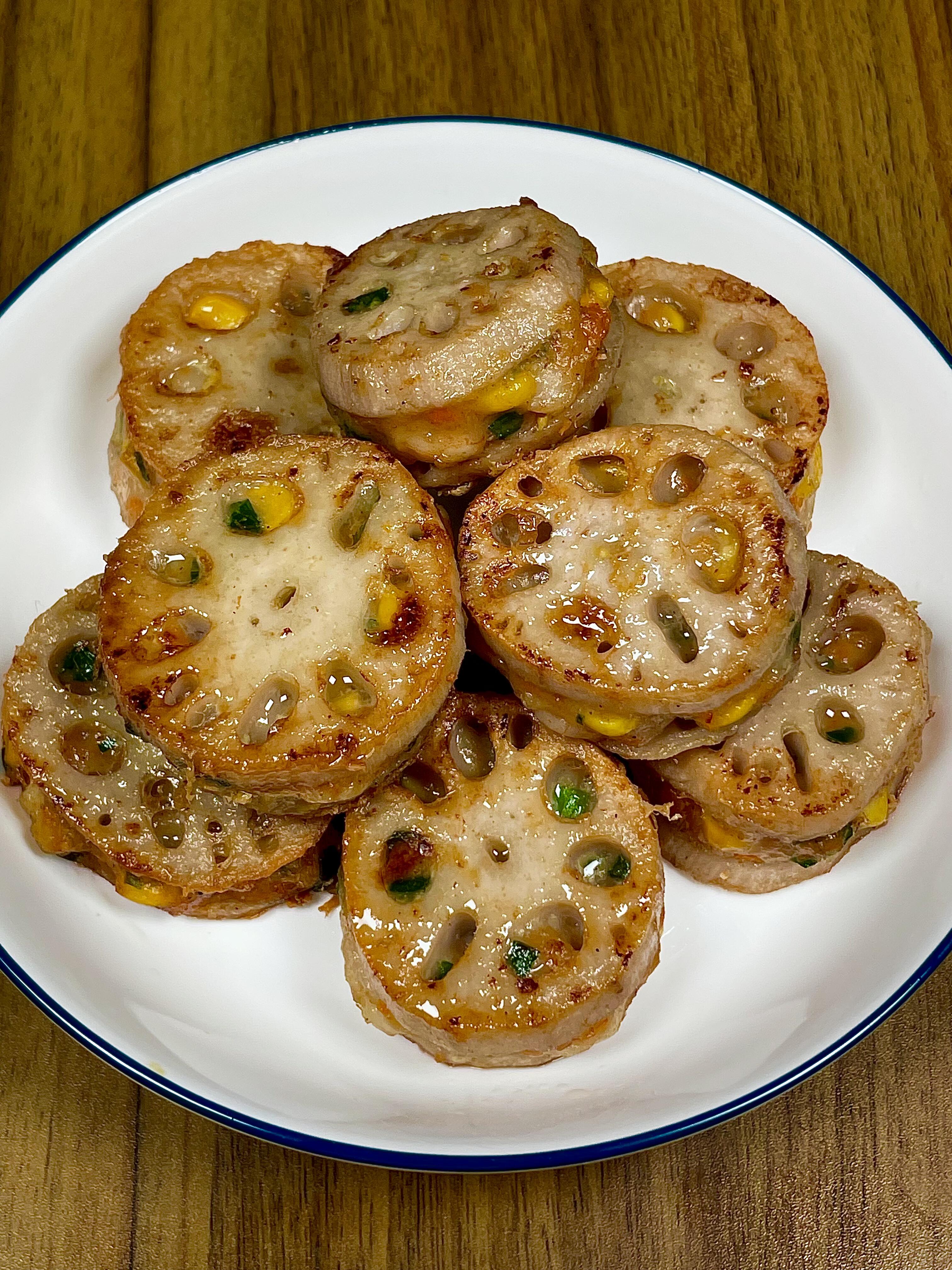 当一盘金黄酥脆的莲藕虾滑饼端上桌,那香气瞬间弥漫整个房间。咬上一口,外酥里嫩,莲藕的清甜、虾滑的鲜美、玉米和胡萝卜的香甜,还有葱花的香气,各种味道在舌尖上交织,简直太美妙啦!