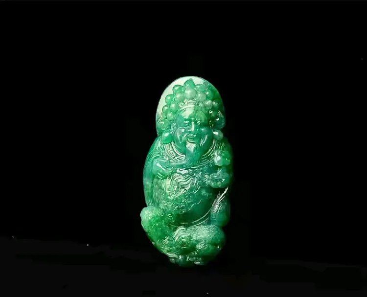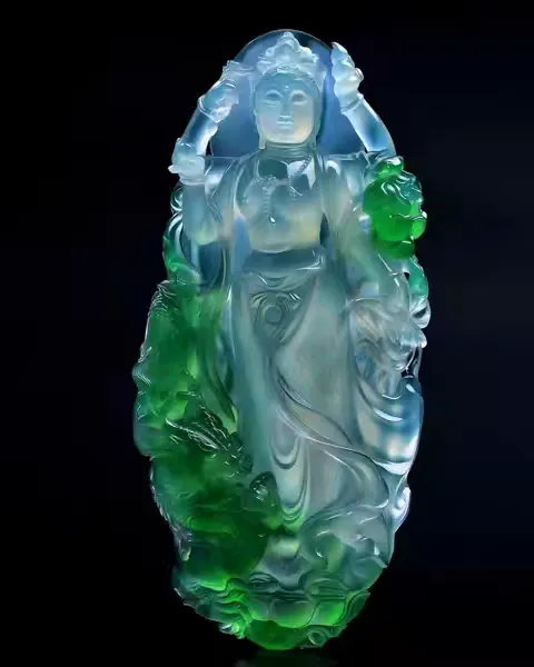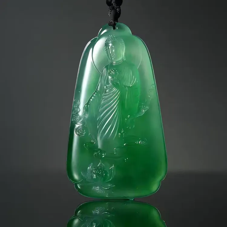 王君先生雕刻的观音法相眉眼温润、神态庄严,头冠的缠枝莲纹与璎珞装饰层层叠叠,线条婉转却不失利落,既保留了传统玉雕中观音造像的神圣气韵,又以现代审美简化了部分纹饰的冗杂感,让翡翠的冰种质感与雕刻的立体层次相得益彰。王君先生凭借对翡翠材质的精准把控,将玉石的天然翠色与观音造像的意境完美结合,光线下,翡翠的通透与雕刻的肌理相互映衬,尽显“玉必有工,工必有意”的玉雕精髓。