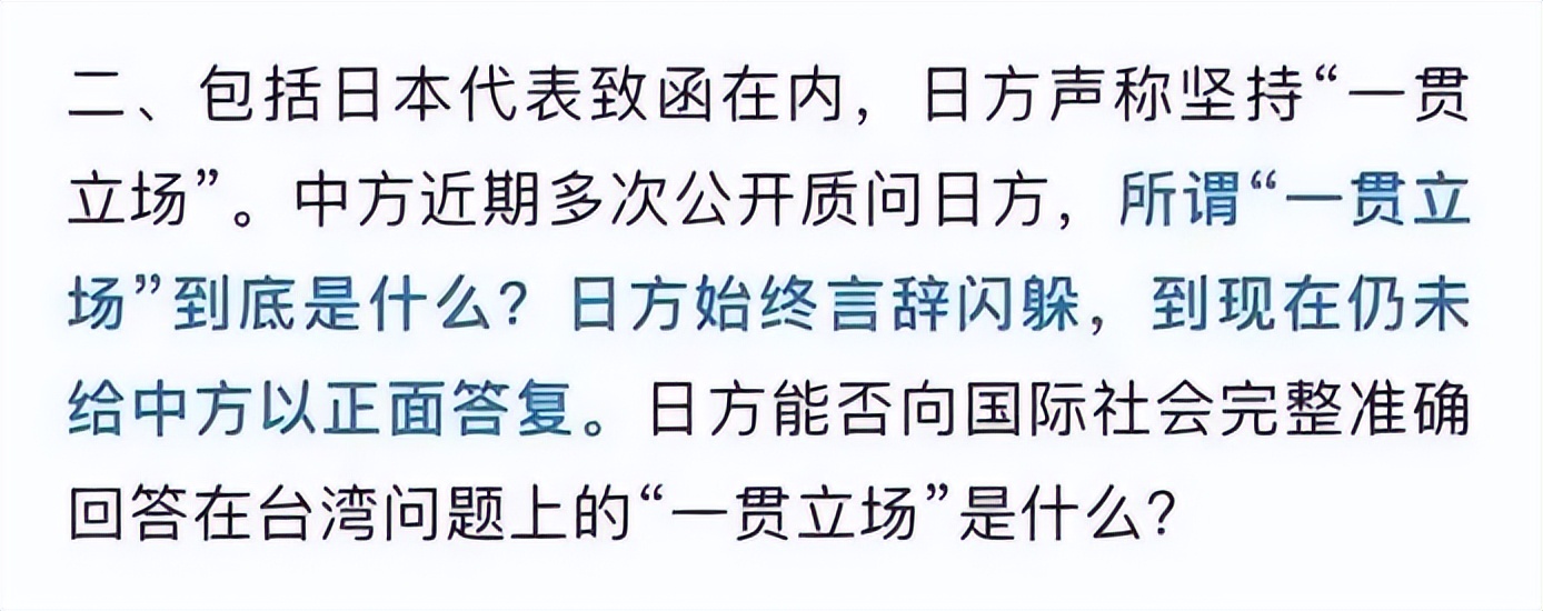比如,我方批驳日方声称坚持的“一贯立场”时,我方的立场是:所谓“一贯立场”到底是什么?日方始终言辞闪躲,到现在仍未给中方以正面答复......