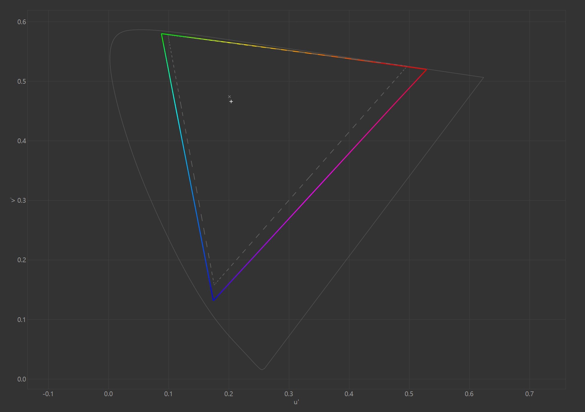 参考DCI-P3色域图谱可以看到,虚线区域是标准色域范围,而彩色线区域是XPS 16屏幕的实测覆盖范围,所以这块屏幕的色域表现是足够出色。