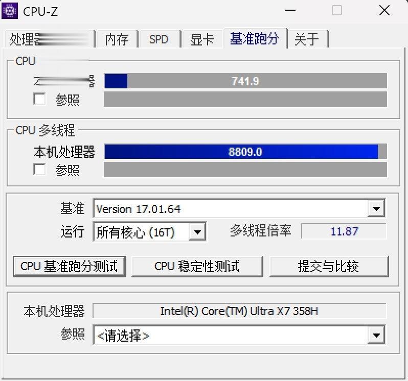 在CPU-Z测试标准下,英特尔酷睿Ultra X7 358H单核得分741.9,多核得分8809。在35W功耗下其实酷睿Ultra X7 358H依然是有比较好的性能表现。