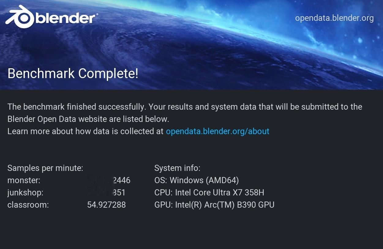 酷睿Ultra X7 358H处理器在V-Ray Benchmark测试标准下,一分钟采样率为17987 vsamples,Corona 10 Benchmark光线渲染速度可以达到5421687 rays/s,Indigo Bedroom和Supercar两张图片渲染采样速度分别达到了1.761M samples/s和4.505M samples/s,而Blender Benchmark的monster、junkshop和classroom三项测试中,1分钟采样率分别为121.37、80.04以及54.92 samples,整体渲染和采样性能较前代同级别处理器来说提升幅度相当明显。