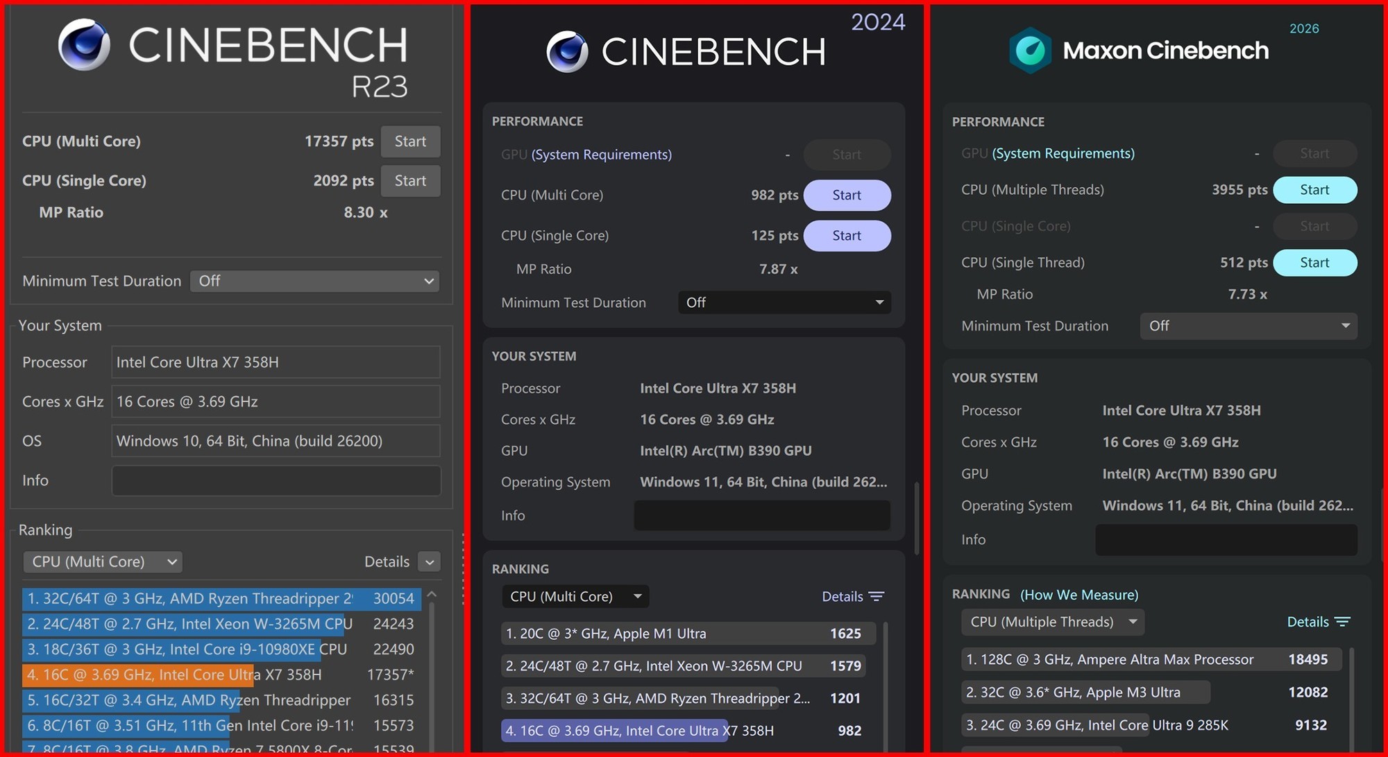 CINEBENCH测试标准下,R23单核得分2092,多核得分17357;2024标准下单核得分125,多核得分982;2026测试标准下,多线程得分3955,单线程得分512,相比50W功耗的酷睿Ultra X7 358H而言,单核性能释放完全没有劣势,而多核性能大约只低6%左右,整体表现超出预期。