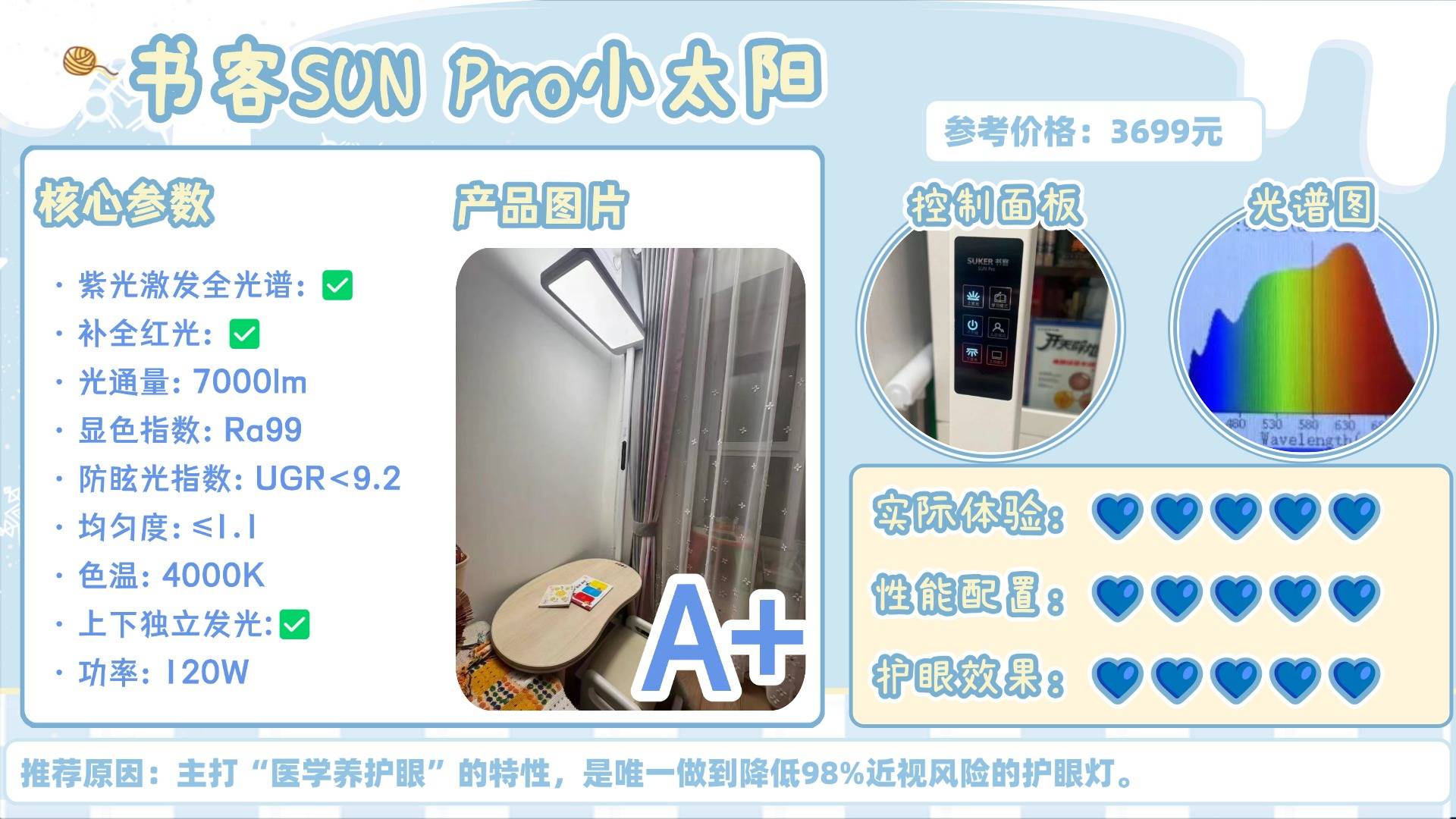 推荐款:书客护眼大路灯Sun Pro小太阳——在各大中高端口碑、销量排行榜中常年霸榜第一,有效降低98%近视风险。