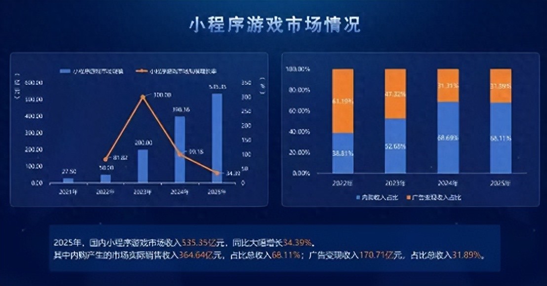 2025年小游戏大盘535.35亿,较去年增长137亿、增幅34.39%。其中IAP有364.64亿,占68.11%;IAA有170.71亿,占31.89%。