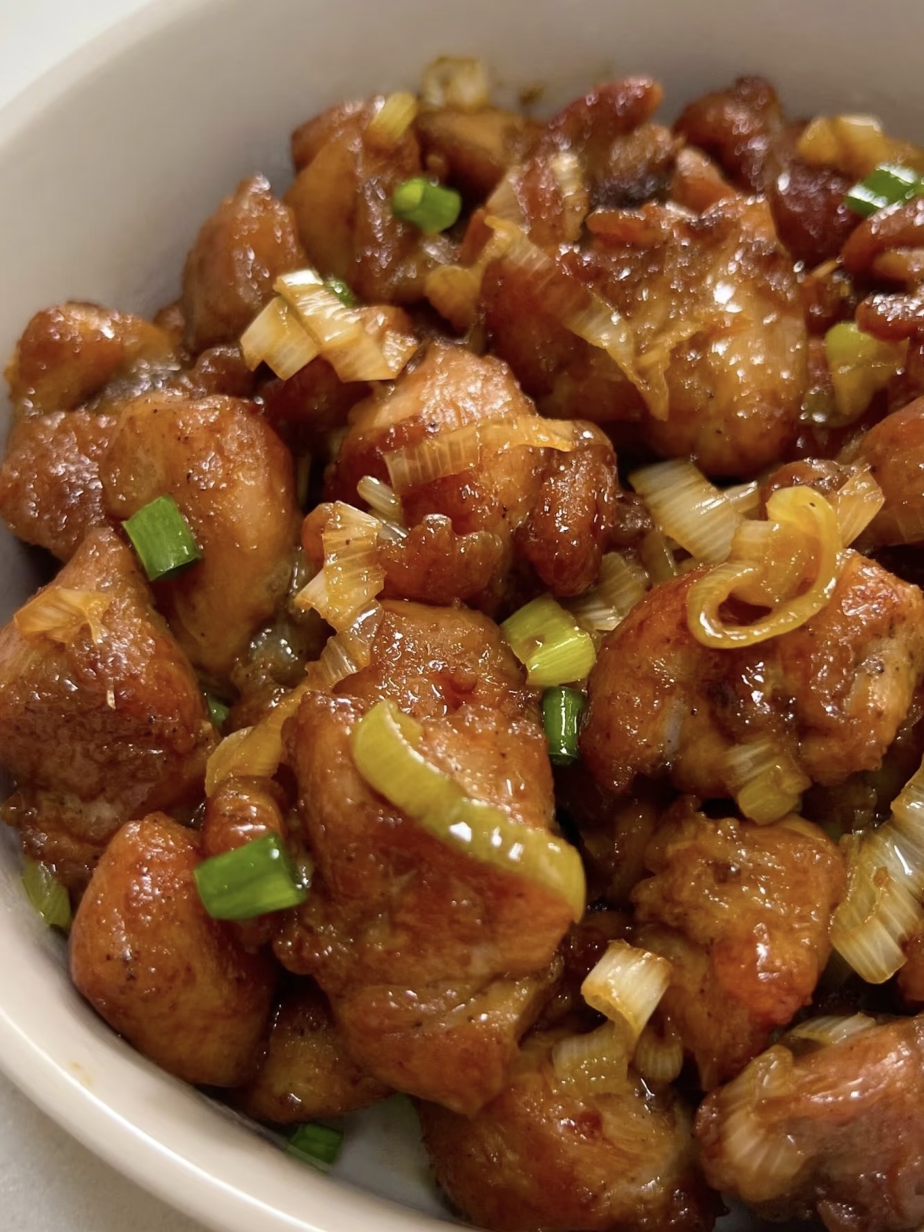成品亮相:鸡块金黄透亮,挂着晶亮酱汁;葱白段奶白微卷,点缀其间;葱叶绿得晃眼,像给“金色小弹”点了“森林星光”。先来一口鸡块——外层吸满葱香和酱香,内里嫩到像豆花,轻轻一咬,肉汁在舌尖爆开;再嚼葱白段,“咔嚓”一声,葱香混着肉香在舌尖一闪,回甘清爽;配一口米饭,汤汁渗进米粒,不知不觉碗底朝天;空口吃也过瘾,鲜到眉毛打秋千。