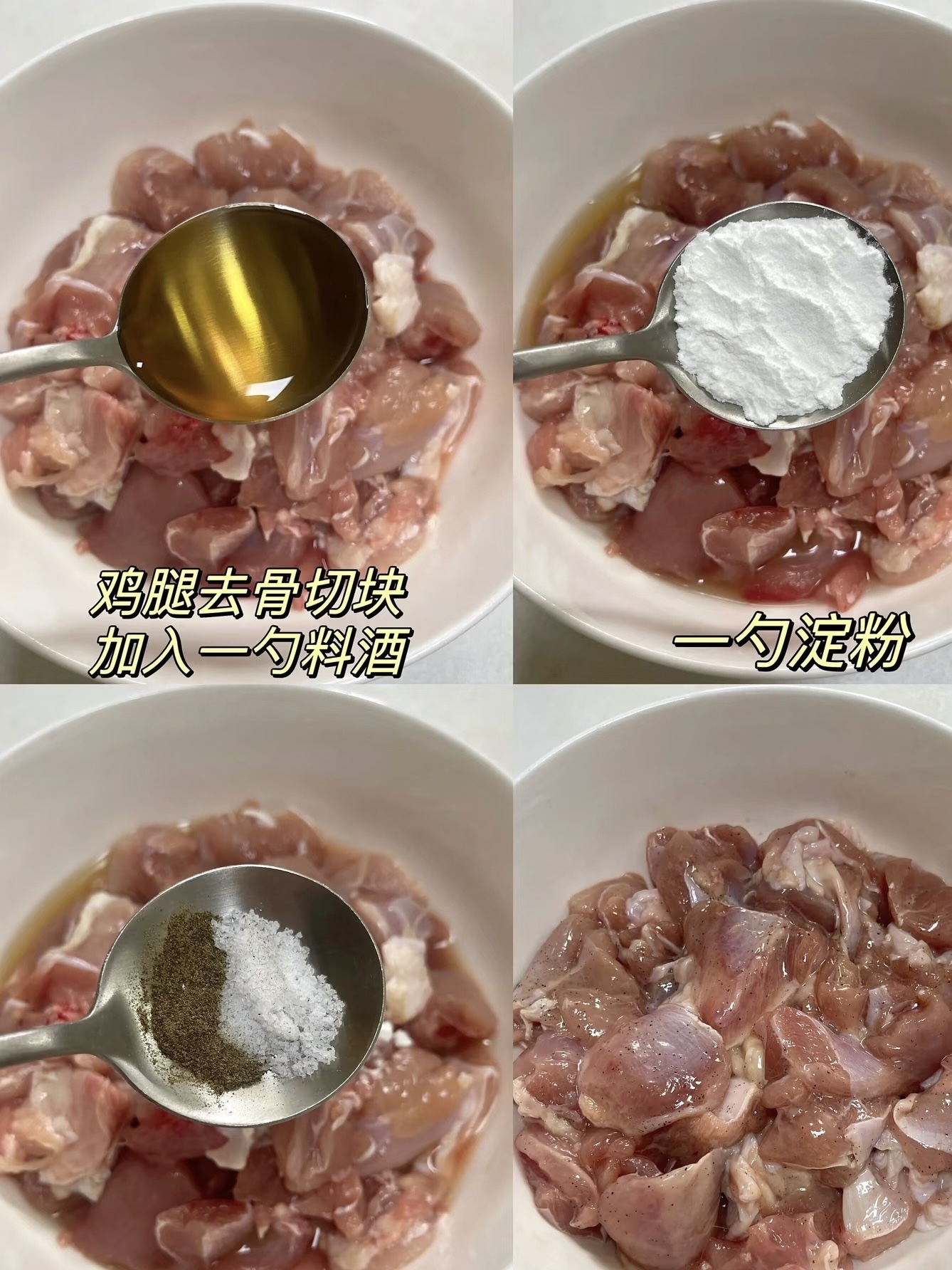 鸡腿3只(约500g),让摊主帮忙去骨,回家切2厘米大块,冷水冲5秒去血水,挤干后加1勺料酒+1勺生抽+半勺蚝油+少许白胡椒粉+1勺淀粉,抓至发黏,静置15分钟——淀粉锁汁、生抽提鲜,后面煎的时候才“嫩到发光”。