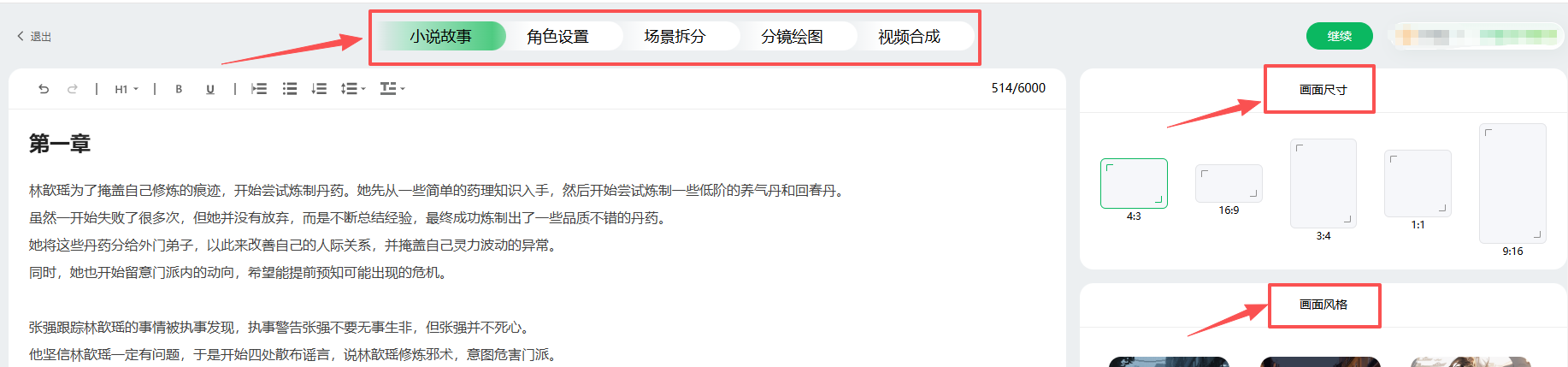 导入小说文档后,选择风格和 16:9 视频尺寸;