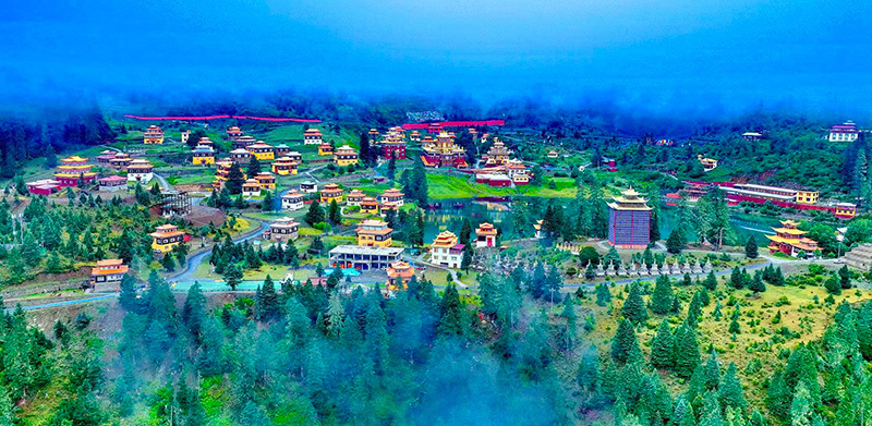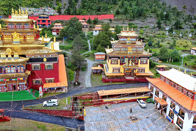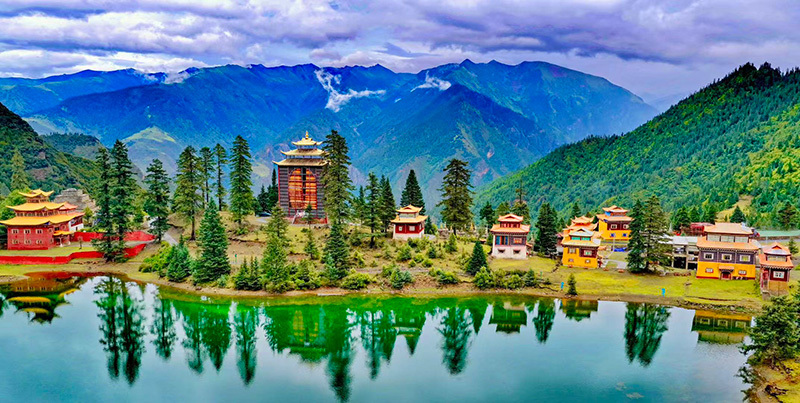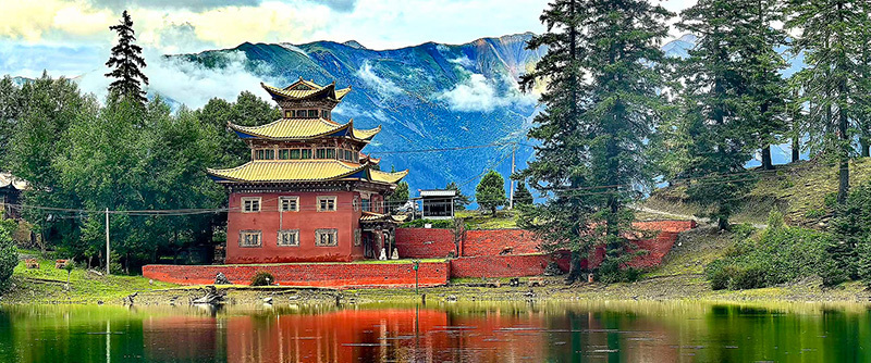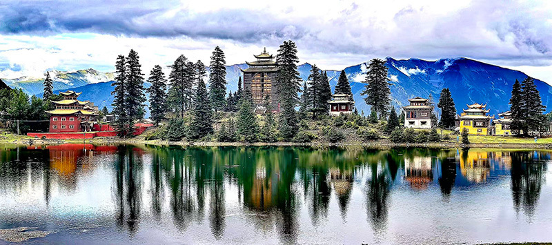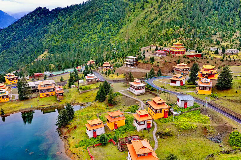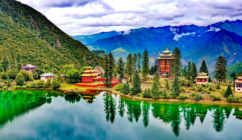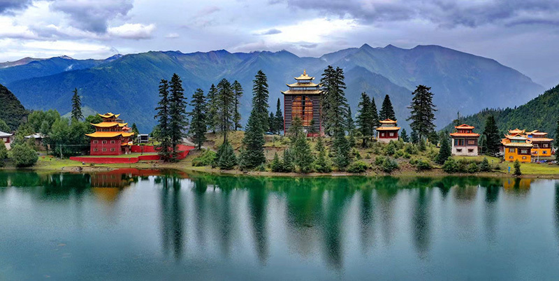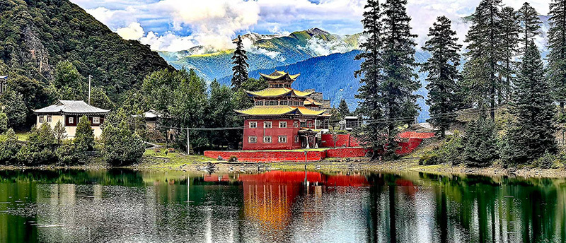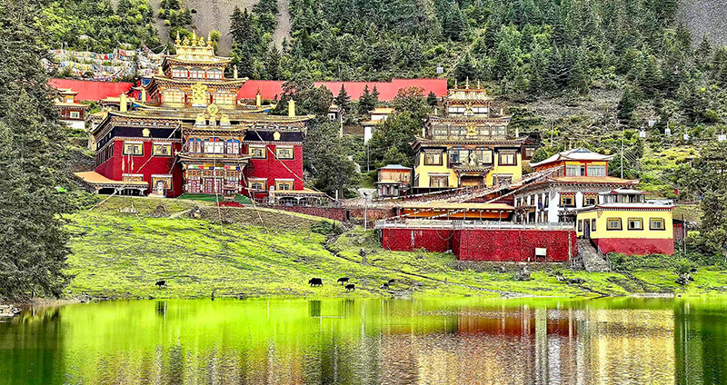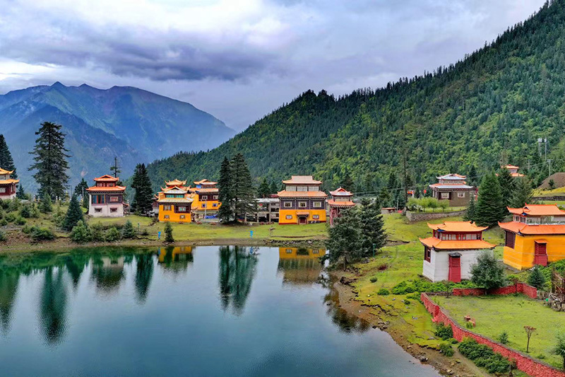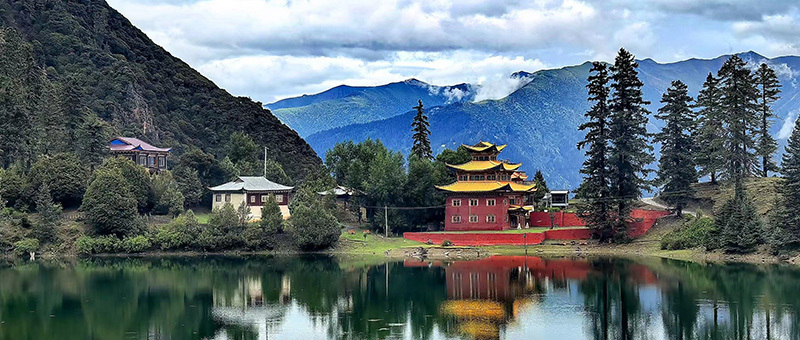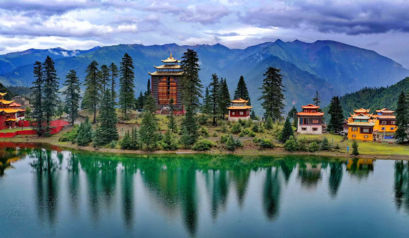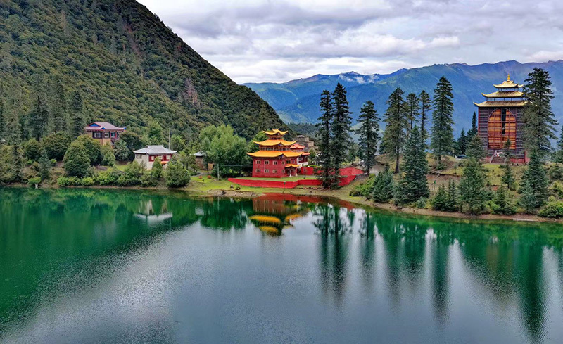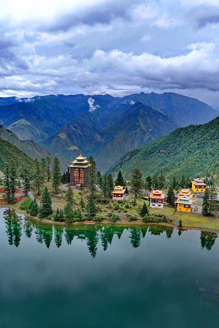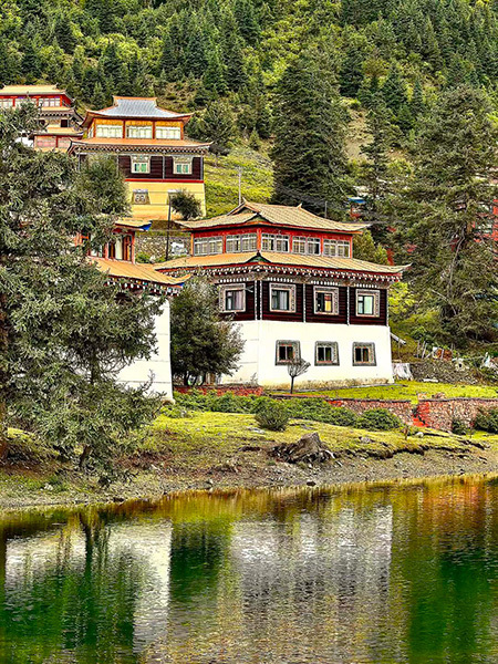最奇绝的是倒影。环抱着湖泊的,是连绵的青山与一座小小的措卡寺及周边建筑。绛红的寺墙、金黄的檐顶、五彩的经幡,还有山脊上墨绿的冷杉、苍褐的岩壁,全都一丝不差地、完完整整地拓印在湖中。风极轻极静时,湖水便是一面无瑕的镜子,天上的流云与湖底的云影悠然对望,让人分不清哪一面才是真实的人间。偶有一尾不知名的鱼,或许被水底的佛国吸引,轻轻一跃,“叮”的一声,恍如玉磬轻击,于是整个世界的倒影便碎成了千万片流动的金鳞,晃漾着,闪烁着,许久才肯慢慢平息,复归那令人屏息的圆满。