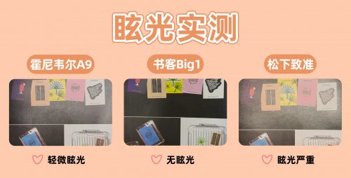 在直接影响使用舒适度的眩光控制上,差距更为明显。书客Big1凭借全光域防眩光技术4.0与多重光学结构,实现了无眩光的顶级表现,光面无反光,即使直视光源也仅感柔和,毫无刺眼不适。霍尼韦尔A9存在轻微眩光,在大多数角度下光线柔和,但在特定视角或长时间直视时可能感知到轻微光晕。松下致准的眩光问题则较为突出,光面书本上可见明显反光点,直视光源时刺眼感较强,视觉舒适度一般。