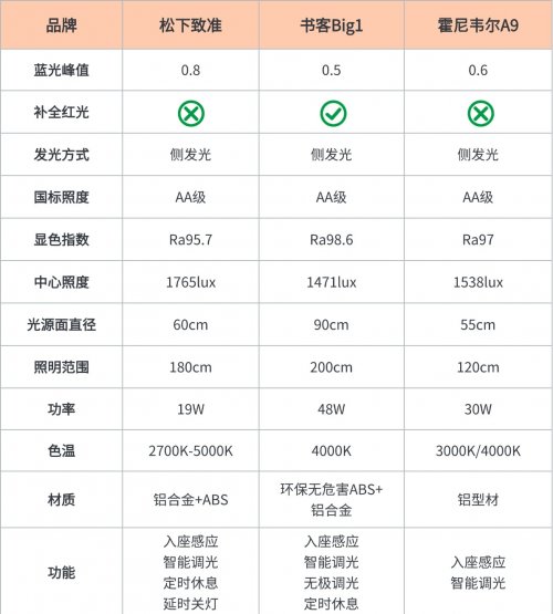 二、核心数据一览护眼台灯的护眼底色藏在关键参数里,为了让大家直观看清书客Big1、霍尼韦尔A9、松下致准在蓝光控制、光场覆盖、防眩光等核心维度的差异,我们整理了关键参数表格,通过这些数据能快速定位每款产品的优势与短板,为选购提供清晰参考。