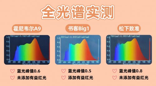 在光谱这一核心维度上,三款台灯呈现出清晰的梯度。书客Big1表现最为卓越,其蓝光峰值被严格控制在0.5的极低水平,并凭借RRT3.0红光养眼技术实现了显著的红光增益,光谱连续性出色,从根源上实现科学控蓝+主动补红的深层护眼,能为眼底细胞补充能量,有效降低92%近视风险。霍尼韦尔A9的蓝光峰值为0.6,同样控制比较优秀,但是不具备红光增益,缓解视觉疲劳的效果较弱。松下致准的蓝光峰值为0.8,没有红光补充,在光谱的完整性与视觉的长期舒适性上有所局限,但基本能满足日常使用需求。