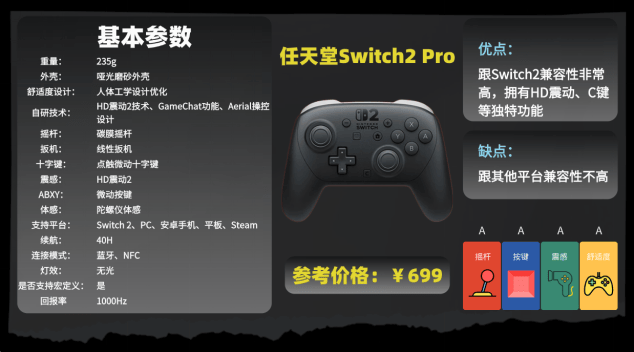 操控方面,摇杆滑动顺畅、指向精准,按键微动手感干脆。HD震动做了升级,游戏沉浸感更强,新增的GL/GR背键可自定义,加上C键语音功能,操作效率明显提升。不过它没用到霍尔摇杆,存在轻微漂移风险,耐用性表现一般。支持一键唤醒主机,自带耳机接口,生态比Joy-Con更全,仅机身重量和厚度稍有增加。续航与连接都很稳定,适合喜欢动作、弹道操作类游戏类游戏,看重操控体验的玩家。