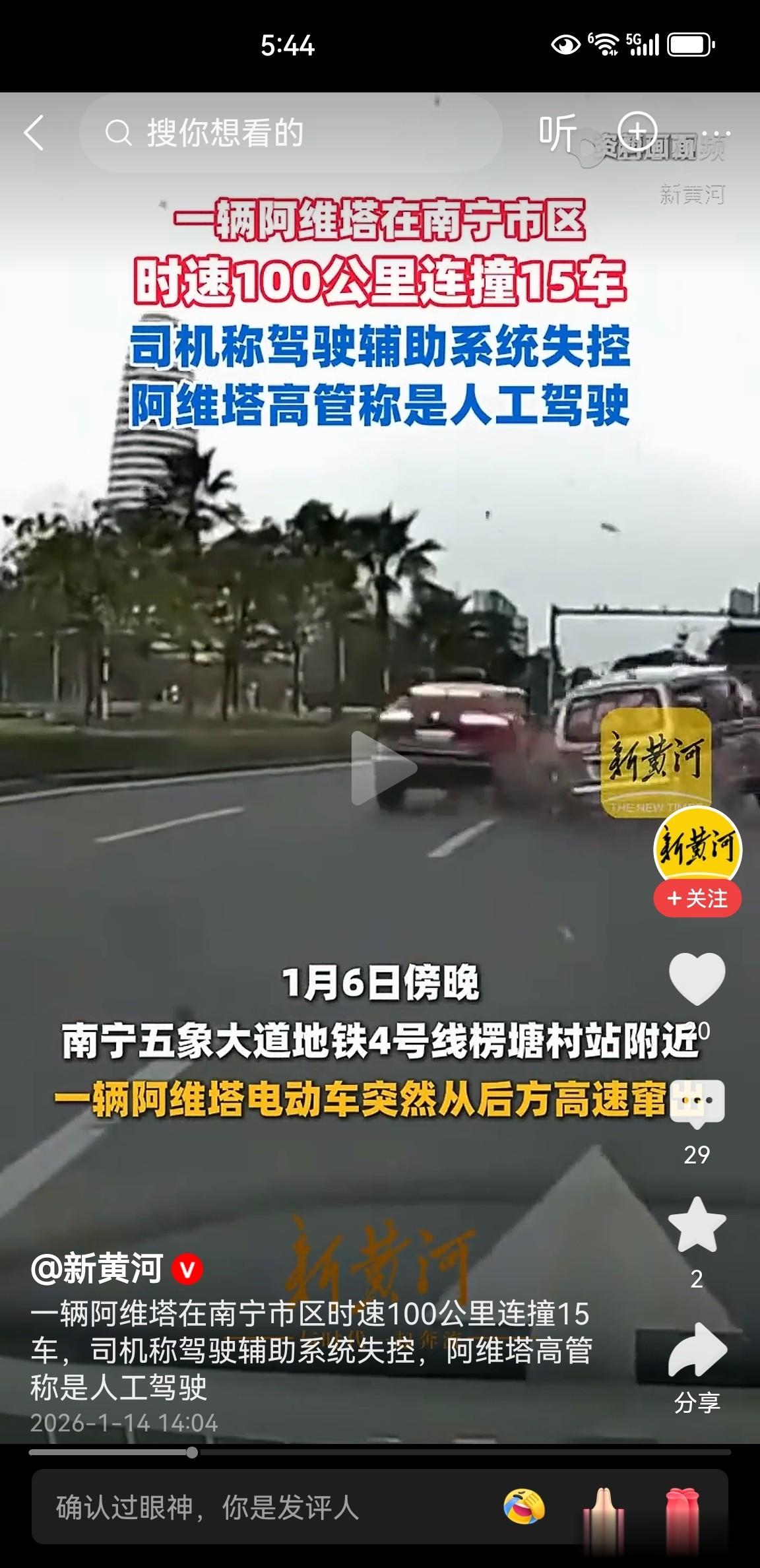 2026年1月6日傍晚,广西南宁市区发生惊险一幕,一辆阿维塔电车失控接连撞上前方15辆车,引发连环事故,多名伤者被送医,当事司机只是受了轻伤。