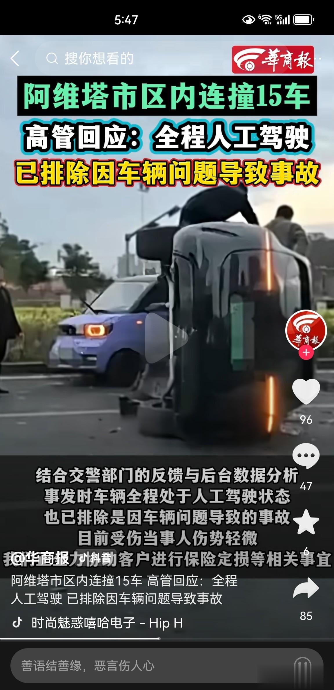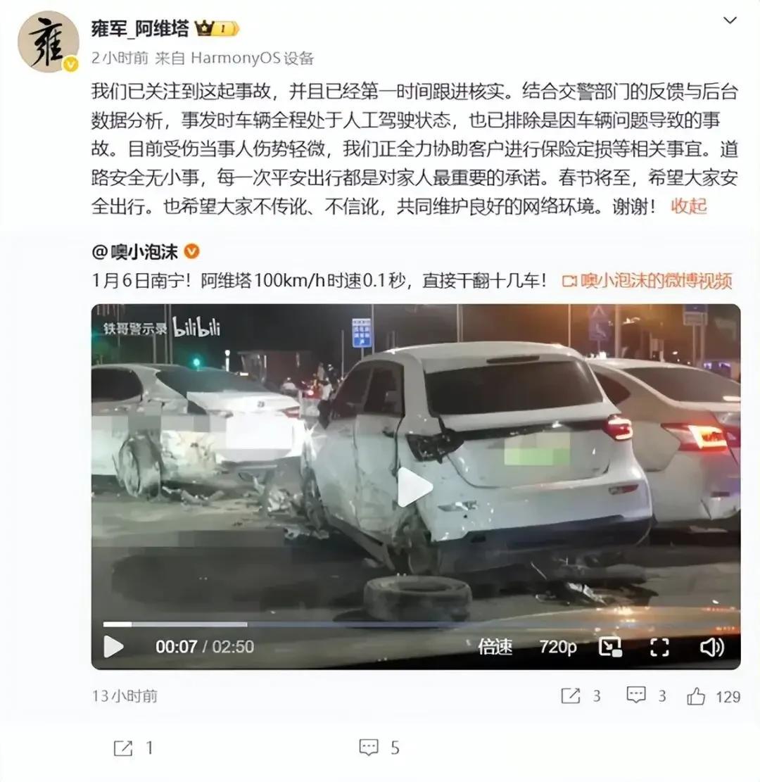 阿维塔副总裁回应对此,阿维塔科技副总裁雍军做出回应。他表示事故发生后,公司第一时间派人跟进核实,后续结合交警部门的反馈和车辆后台数据进行分析,得出的结论是:事发时车辆全程处于人工驾驶状态,也已排除是因车辆问题导致的事故。