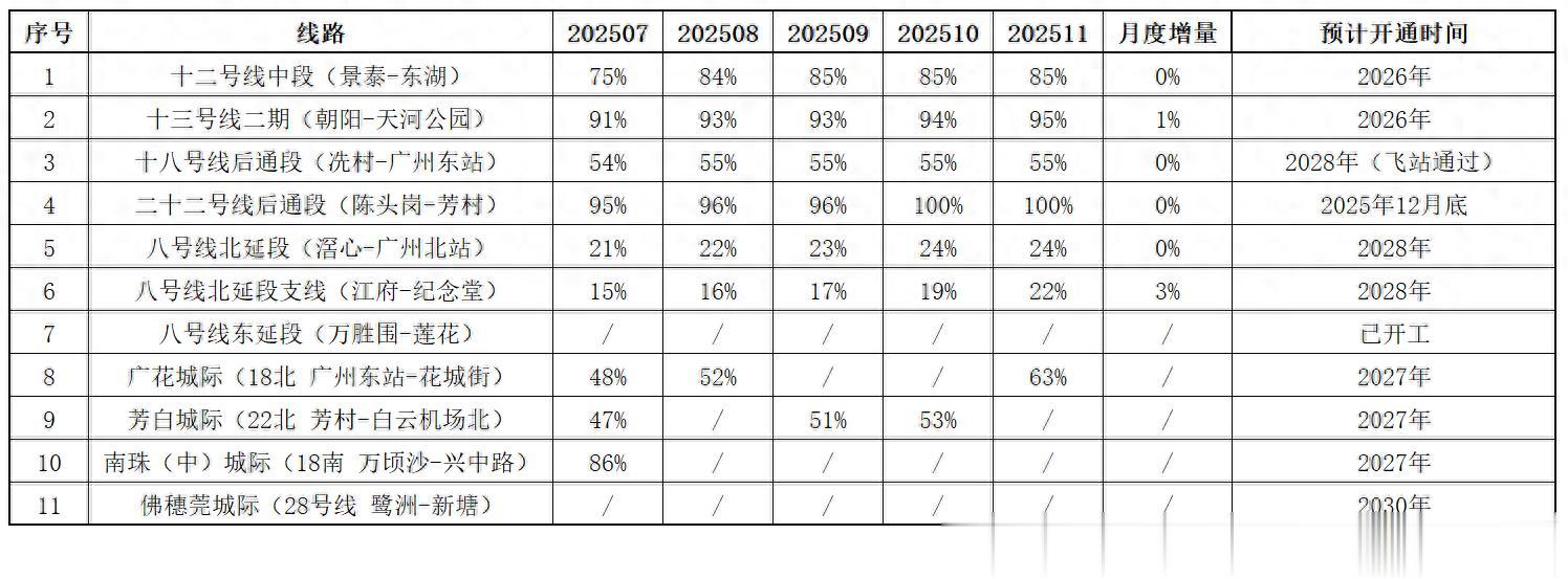 广州地铁目前正在推进11条(段)轨道交通新线建设。各线概况及建设进展情况如下: