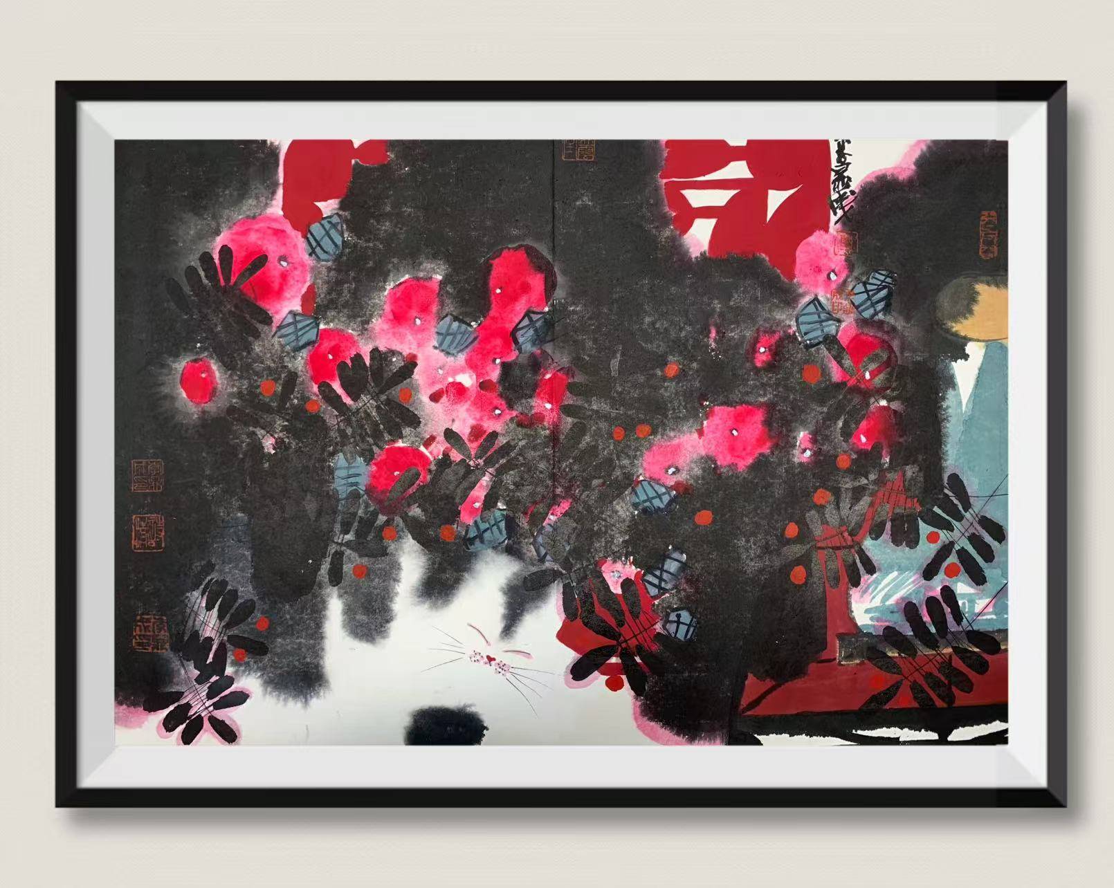 近年之作,尤见破立之勇。朱砂研彩,创“花猫”系列,赤彩灼灼似霞浸宣纸,猫姿灵动若戏于文房。此中妙处,在化传统文人闲趣为现代视觉诗语,炽烈处不失清雅,稚拙中暗藏机锋,可谓“以古人之眼观物,以今人之心造境”。至若山水长卷、林泉小品,或墨渖淋漓如夜雨润山,或敷色明净若春晓初开,皆可见其对“逸品”精神的当代诠释——非避世独吟,乃以笔墨叩问永恒之美。