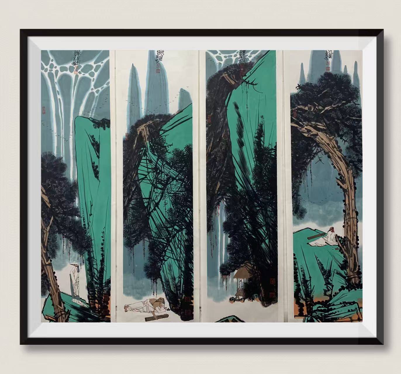 李先生为南京书画院之菁英,早岁深植六朝文脉,融通南北宗风,笔底既有南韵之清雅,亦见北气之雄浑。昔年李伯安先生以“当代逸品十家”相誉,非虚誉也。其艺术之途,如江流迂回,初以传统为源,继而广涉百家,终在墨海中觅得自家灯火:青绿山水承唐宋遗韵,然不囿于古法,色墨交织间可见江南氤氲、皖峰奇崛;写意笔法工致处见精微,放逸时显神纵,二者相契,如琴瑟和鸣,浑然而成天籁。