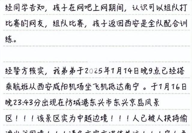 不过,段越耀姐姐还在恳求南宁朋友帮忙打听下落的时候,一位热心网友就联系到她,表示自己已经从防城港警方那里得到消息,确定段越耀在16日夜里出现在防城港的东兴京岛风景区。