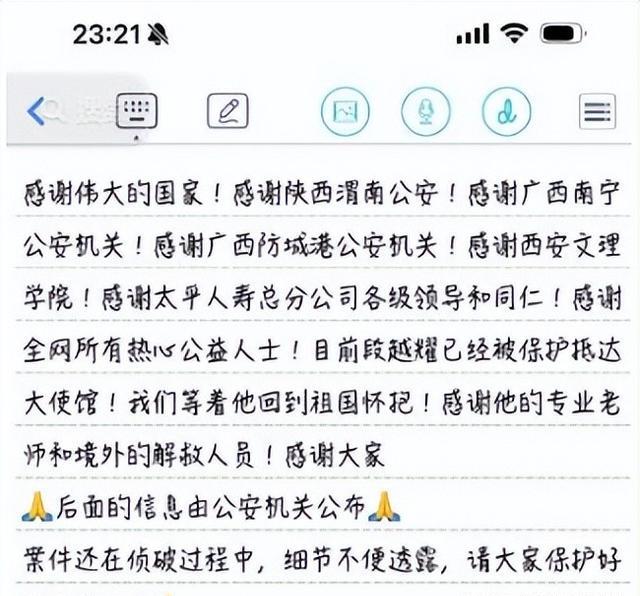 虽然在段越耀姐姐的回复里,因为案件还处在侦破阶段,段越耀很可能在春节前无法回家,但这个好消息还是让积极参与到营救中的各界人士感到十分欣慰与喜悦。