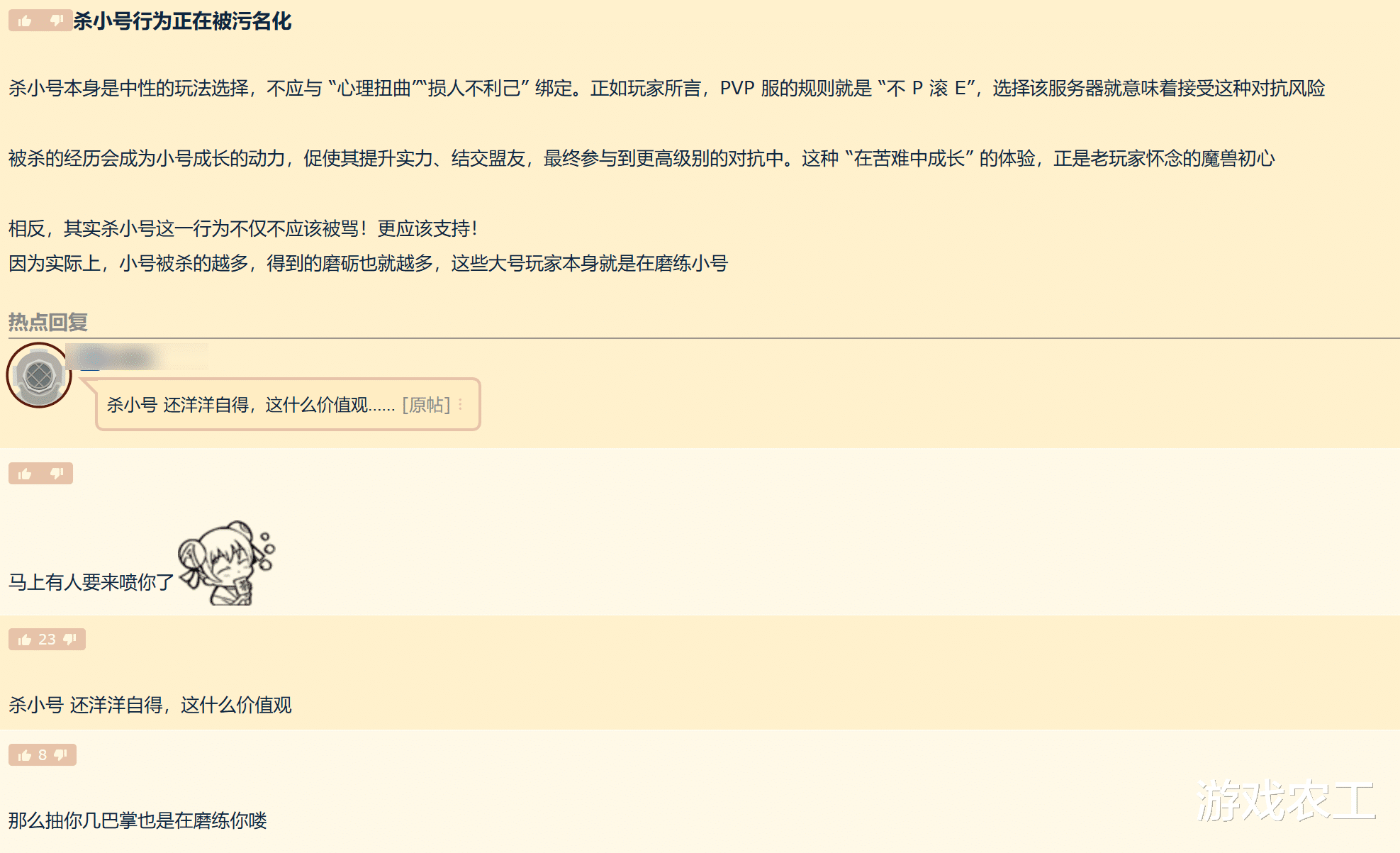 那么玩家如何看待呢?有个玩家直接说终于能在地狱火半岛练级了,并且还表示天上还有一堆打小号的大号,所以农工一直不理解,为什么PVP模式变成了打小号的模式,而不是大号之间的竞争,不打大号,只打小号本质其实就是菜,打不过大号,只能寻找小号去发泄,但是现在这个途径也被雷火给堵了,估计又会找新渠道了。