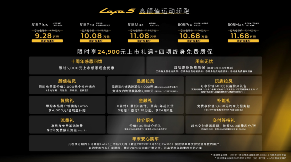 新车发布515km及605km两种续航版本共计5款车型,并推出限时5000元上市感恩现金优惠,即日起至2025年12月31日24点,零跑Lafa5上市限时惊喜价9.28-11.68万元,以极其诚意的定价与品价比,重新定义10万级纯电轿跑市场价值新标准。