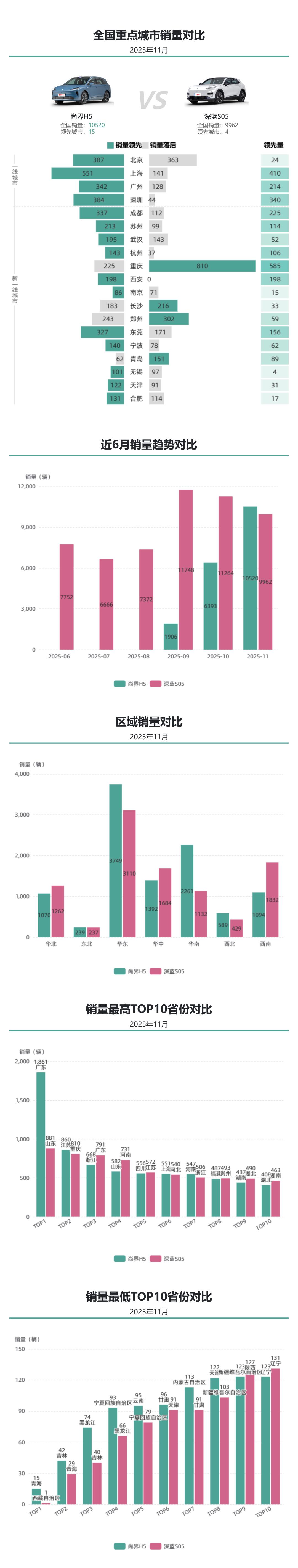 当前中端纯电SUV市场已形成尚界H5与深蓝S05双强并立的格局。11月,尚界H5全国销量10520辆,略微领先于深蓝S05的9962辆,两者体量已处于同一梯队。