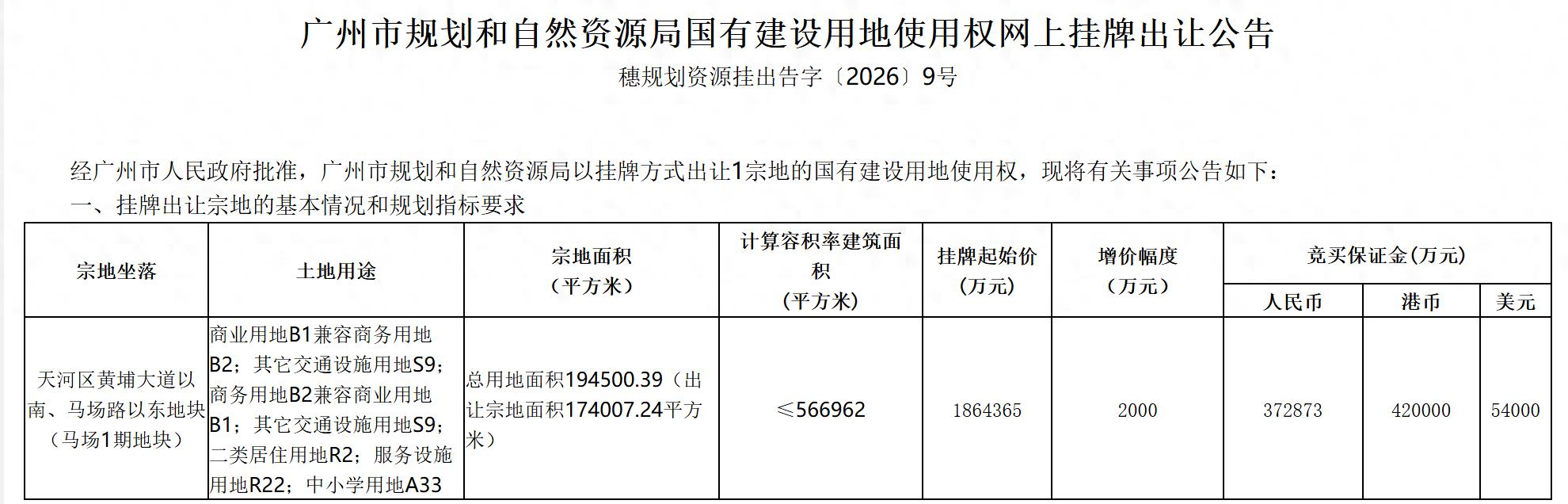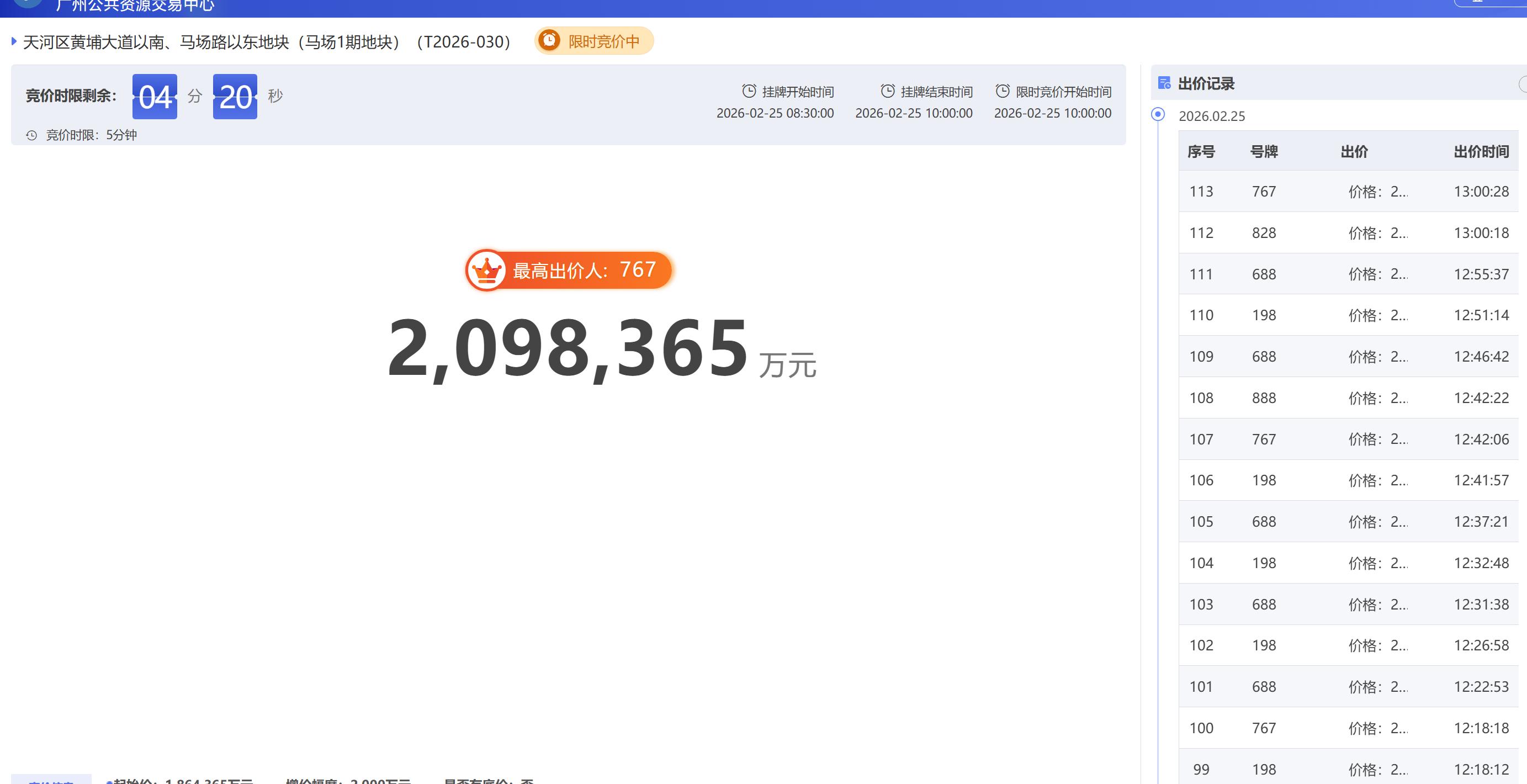 新快报讯 2月25日上午10时,天河区黄埔大道以南、马场路以东地块(即马场1期地块)正式开启限时竞价。保利、越秀、华润、广州城投、广州建筑、珠江实业等多家房企悉数下场,展开激烈角逐。