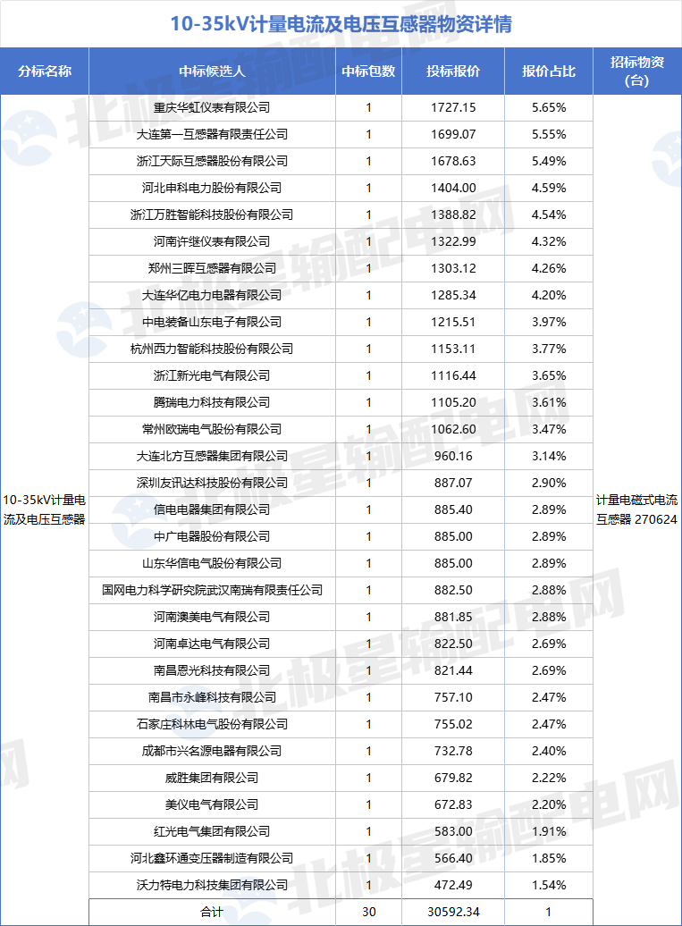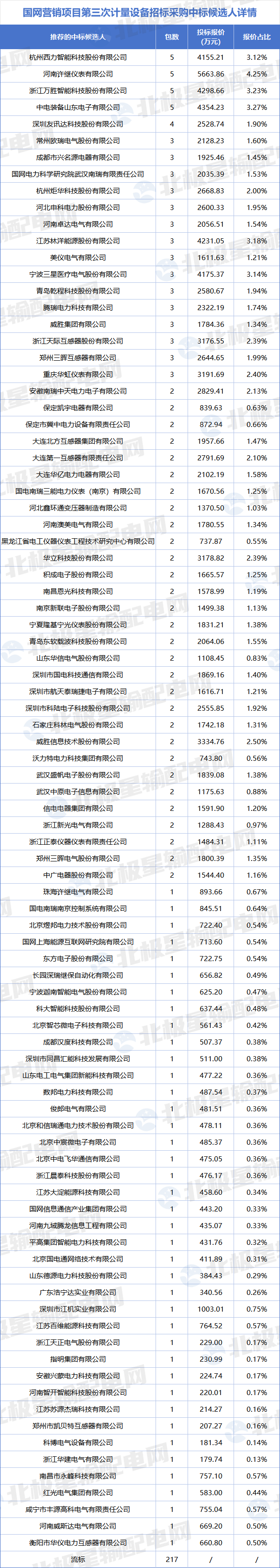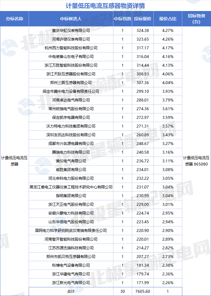 本次招标共有90家企业入围中标候选人,其中杭州西力智能科技股份有限公司投标报价最高,共计约4155.21 万元,入围5个标包,入围物资包括2100个智能融合终端、4200只智能融合终端模组、11000套专变采集终端、11000只通信单元、36000台计量低压电流互感器、10200台计量电磁式电压互感器、2100台计量组合互感器。
