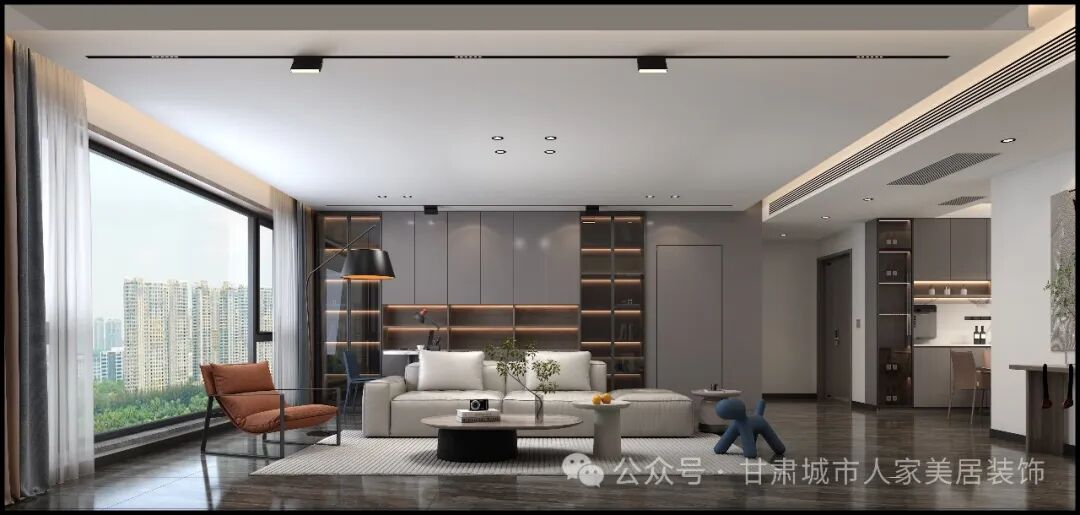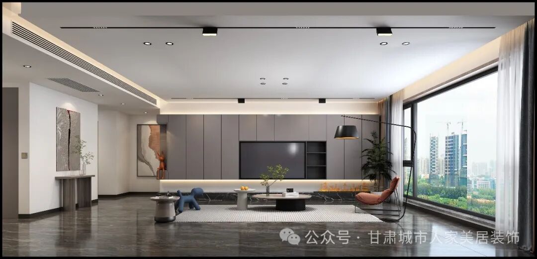 整个客厅采用了现代简约的设计风格,色调以中性色为主,地面铺设的深灰色大理石纹理地砖,与浅灰色的墙面形成了鲜明的对比,营造出一种沉稳而不失时尚的氛围。大面积的落地窗设计,让自然光线充分洒入室内,不仅使空间显得更加开阔,同时也将室外的美景引入家中。