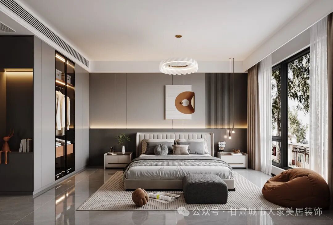 客厅中央摆放着一组简约的浅灰色沙发,搭配几个色彩鲜明的小茶几,形成了一个既实用又美观的会客区。在家具的选择上,设计师注重线条的简洁和造型的现代感。例如,那把橙色的休闲椅和旁边的落地灯,在低调的背景下显得格外醒目,成为客厅中的视觉焦点。天花板上安装的轨道射灯,提供了充足的照明,同时也增强了空间的层次感。卧室———The bedroom主卧延续了现代风格的设计理念,以简洁和舒适为核心。一张宽大的双人床位于房间的中央,床上用品的颜色选择了柔和的灰色系,搭配几个抱枕,营造出温馨的睡眠氛围。床头背景墙采用了软包设计,不仅增加了舒适度,还提升了整体的质感。